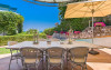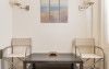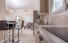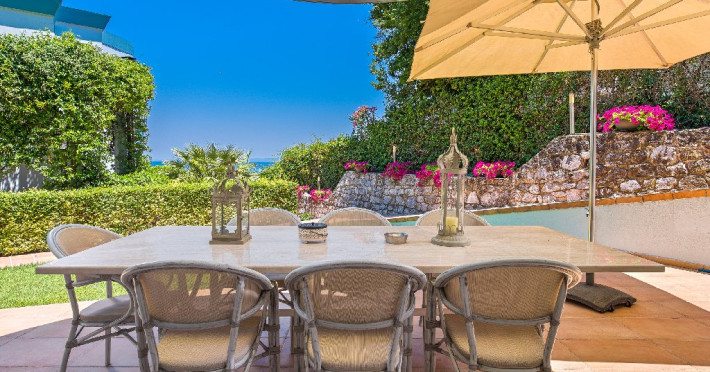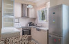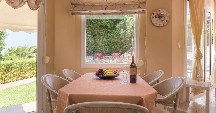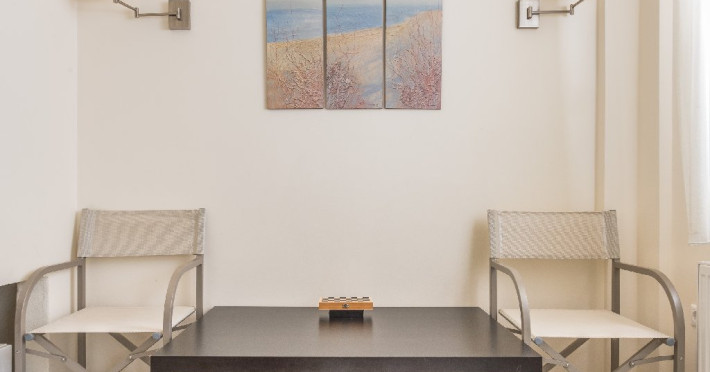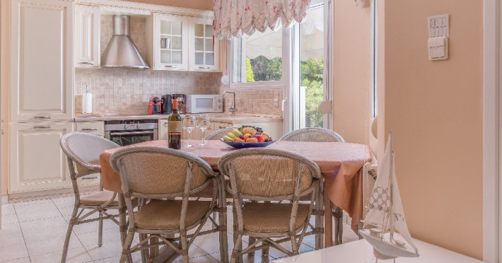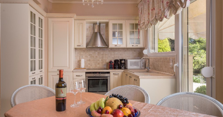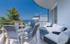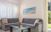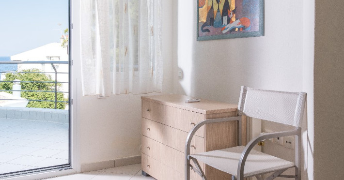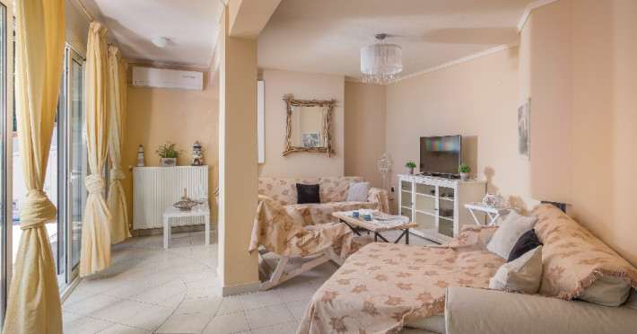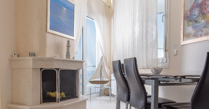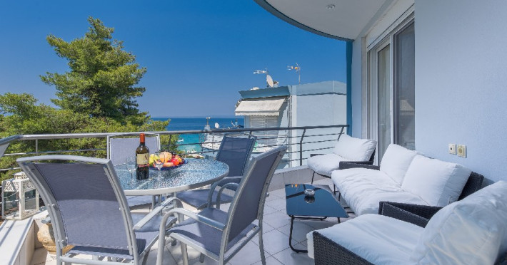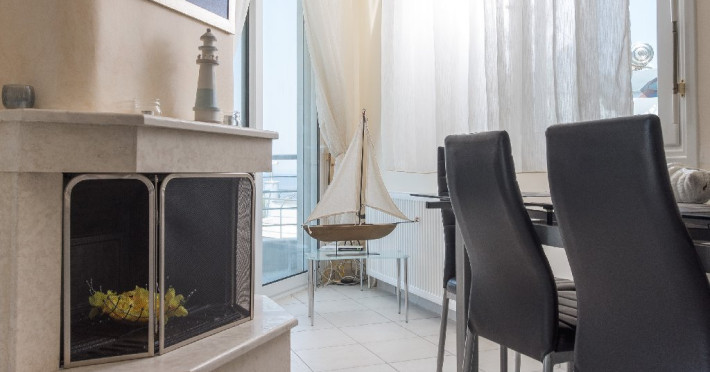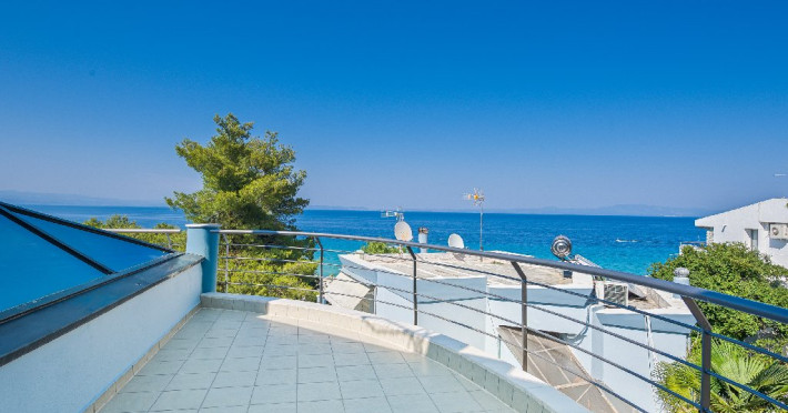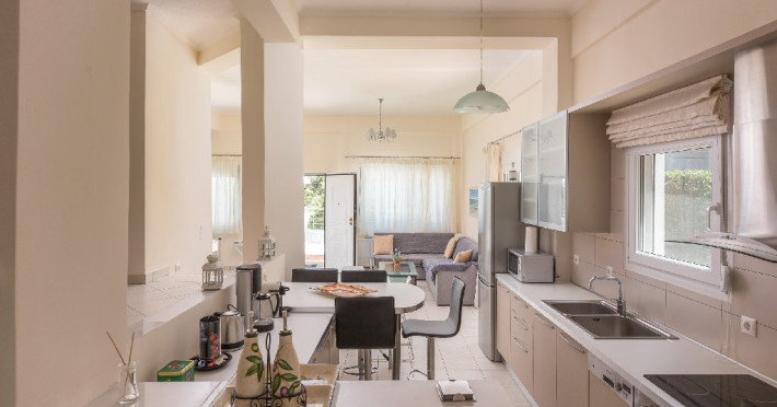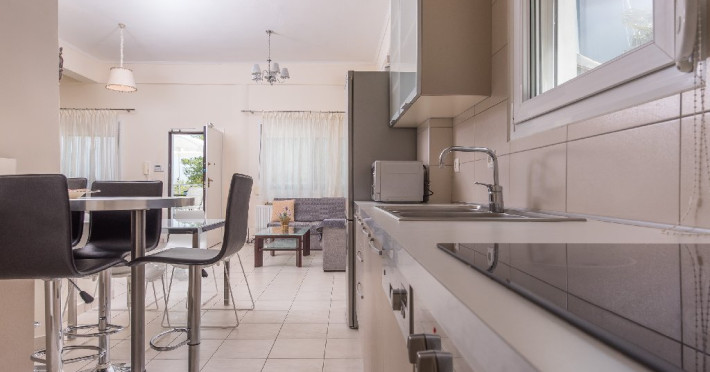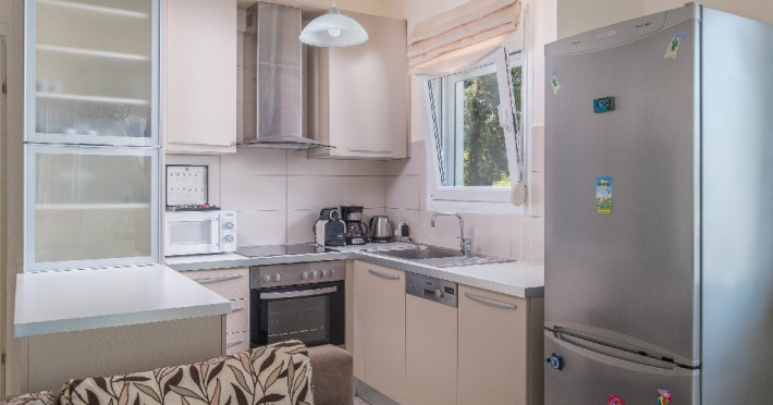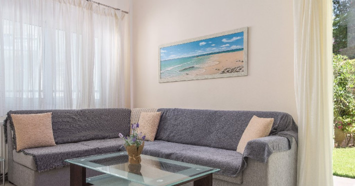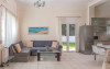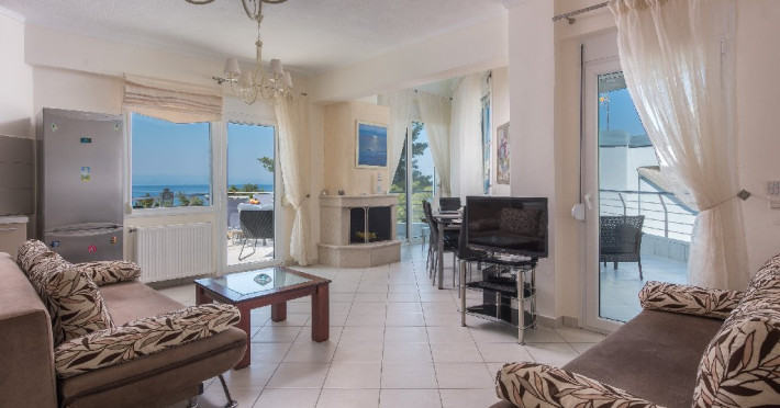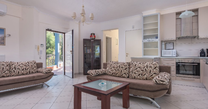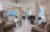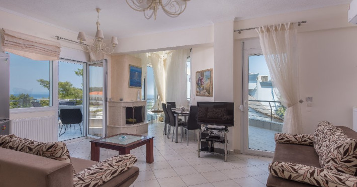 - 1 living cu vedere la mare, cu bucatarie complet utilata, masina de spalat vase, zona de luat masa, TV, iesire la terasa larga, mobilata cu masa/ scaune.
