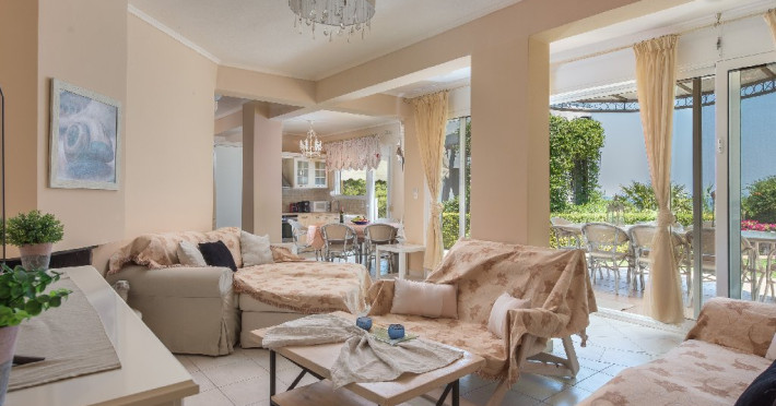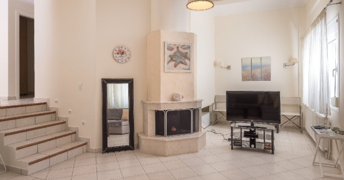 - 1 living cu vedere la gradina, cu bucatarie complet utilata, zona de luat masa, semineu, TV, iesire directa la gradina.