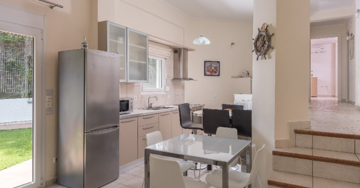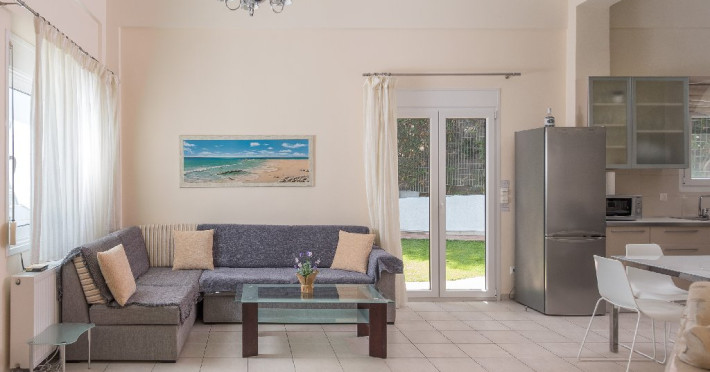 - 1 living cu vedere la gradina, cu bucatarie complet utilata, zona de luat masa, TV, iesire la terasa mobilata cu masa/ scaune si la gradina.