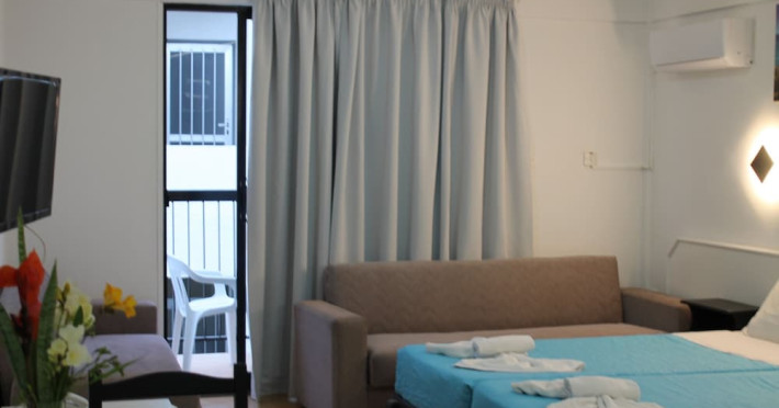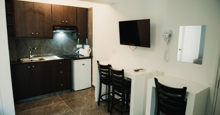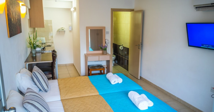 In Ayia Napa (Ayia Napa City Center). In the heart of Ayia Napa, A. Maos Hotel Apartments is within a 5-minute drive of Ayia Napa Monastery and Nissi Beach. This aparthotel is 2.7 mi (4.4 km) from Landa Beach and 4.2 mi (6.8 km) from Cape Greco National Forest Park. Make yourself at home in one of the 50 air-conditioned rooms featuring kitchenettes with refrigerators and stovetops. Rooms have private furnished balconies. 32-inch flat-screen televisions with satellite programming provide entertainment, while complimentary wireless internet access keeps you connected. Conveniences include phones, as well as desks and electric kettles. Grab a bite from the snack bar/deli, or stay in and take advantage of the aparthotels room service (during limited hours). Unwind at the end of the day with a drink at the bar/lounge or the poolside bar. Cooked-to-order breakfasts are available daily from 8:00 AM to noon for a fee. Take advantage of recreation opportunities such as a seasonal outdoor pool or take in the view from a terrace and a garden. Additional features at this aparthotel include complimentary wireless internet access, a television in a common area, and a reception hall.Datorita dinamicitatii domeniului disponibilitatea ofertelor se modifica de la un moment la altul. De aceea ofertele sunt valabile in limita locurilor disponibile. Agentia nu este responsabila pentru eventualele neconcordante care pot aparea intre informatiile privind tarifele si alte detalii din site si informatiile primite in agentie. In aceste cazuri vor avea prioritate, intotdeauna, informatiile primite in agentie.