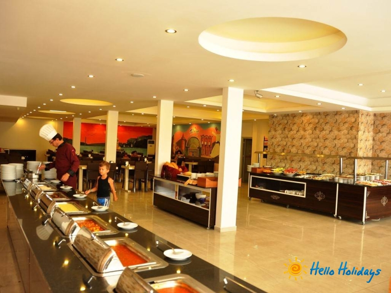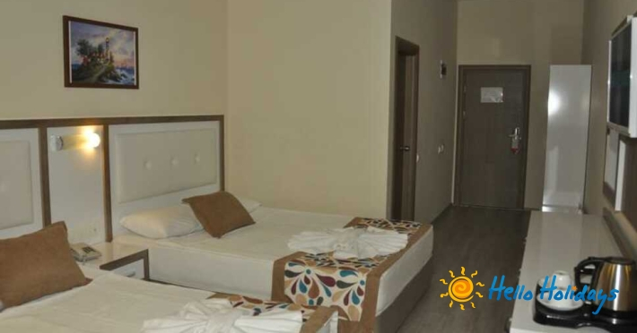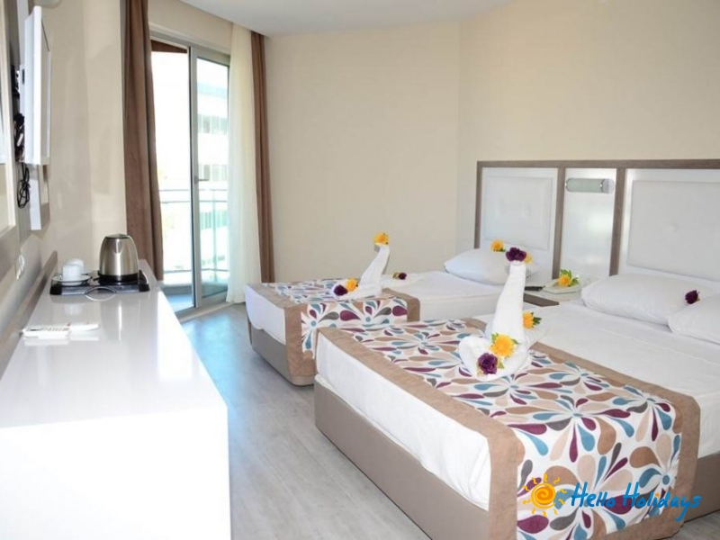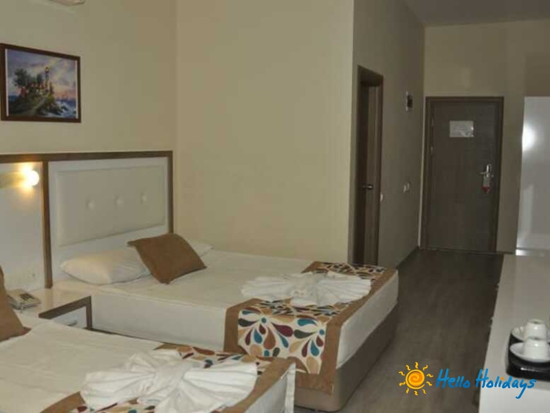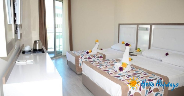 Hotelul ofera oaspetilor o plaja privata pe tarmul Marii Mediterane, piscine pentru adulti si copii, loc de joaca pentru copii, sala de fitness, tenis de masa, volei pe plaja, centru de spa cu sauna si masaj, centru de infrumusetare. La restaurant, se pot savura mancaruri din bucataria turceasca autentica, iar la bar bauturi racoritoare si gustari dulci si savuroase. Parcarea este gratuit pe proprietatea hotelului, iar internetul Wi-fi contra cost pentru intreaga suprafata.