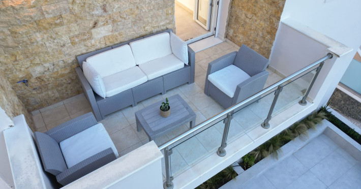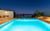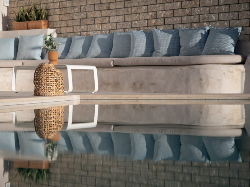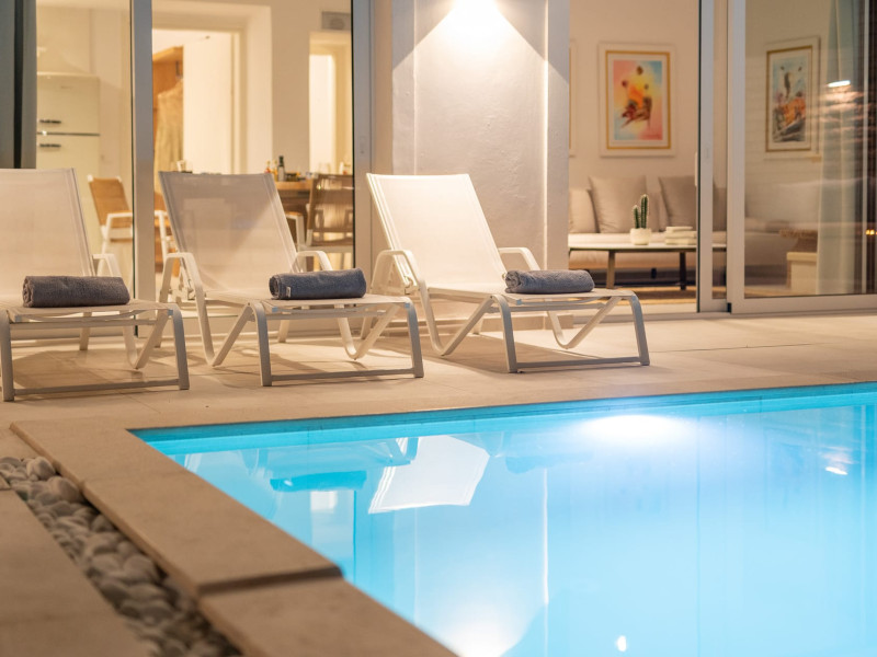 The “Senior Suite with Pool View” is located on the ground floor and it has a marvelous pool and sea view. It includes a big bedroom with a large bed with a flat-screen TV, A/C – heating and a spacious kitchen equipped with all electrical appliances (large 2-door refrigerator, microwave oven, dishwasher, washing machine, iron and iron board). It also has a sitting room, an internal fire place for cold and winter nights and a spacious bathroom with 2 showers, 2 sinks and a hair dryer.