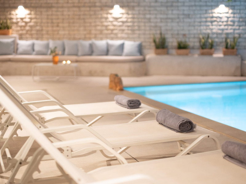 The “Majestic Loft Suite with indoor hot tub” is an open-planed suite located on the first floor of the villa with individual front door. It includes a large bed with a flat-screen TV, A/C – heating and a kitchen equipped with all electrical appliances (refrigerator, microwave oven, washing machine, iron and iron board). It also has a sitting room with sea view and a bathroom with steam/jacuzzi, 2 showers, 2 sinks and a hair dryer.