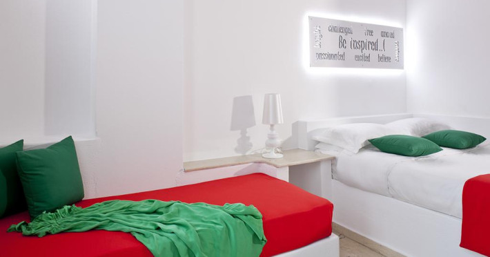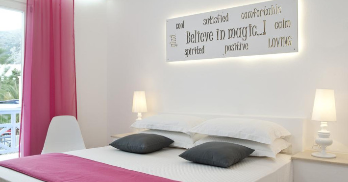 Sunt disponibile 32 camere. Camerele de la Acqua Vatos au în dotare aer condiționat și Tv. Unele camere au balcon, cu vedere la piscină, unde oaspeții se pot relaxa în voie. În camere există baie cu cadă sau duș ce are în dotare articole de toaletă gratuite. Oaspeții au la dispoziție serviciul de room service pentru a servi masa sau diverse băuturi. Oaspeții au acces gratuit la serviciul Wi-fi în camere. Curățenia in cameră se face zilnic. Proprietatea oferă camere pentru familie cu o suprafață mai mare și un număr mai mare de paturi față de cele standard. Se pot rezerva de asemenea camere pentru nefumători.