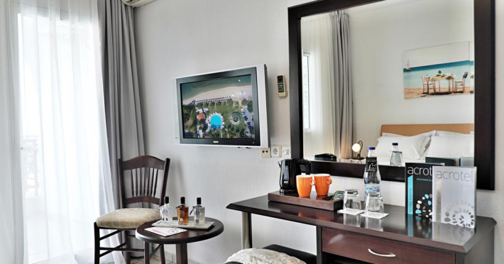 În camere există baie cu cadă sau duș ce are în dotare foehn și articole de toaletă gratuite. Unele camere au balcon cu vedere la mare sau la piscină. Camerele confortabile de la Acrotel Lily Ann Beach au pardoseală de gresie/ marmură, aer condiționat, Tv cu canale prin satelit și seif. Fiecare cameră dispune de minibar și cană-fierbător. Oaspeții pot solicita serviciul de room service pentru a servi masa sau diverse băuturi. Oaspeții au acces gratuit la serviciul Wi-fi în camere. Curățenia in cameră se face zilnic. De asemenea, este disponibilă o zonă de luat masa. Proprietatea oferă camere pentru familie cu o suprafață mai mare și un număr mai mare de paturi față de cele standard. Se pot rezerva de asemenea camere pentru nefumători.