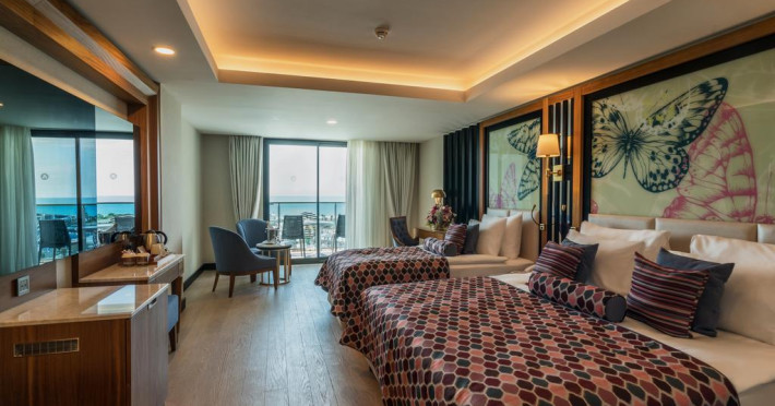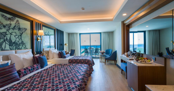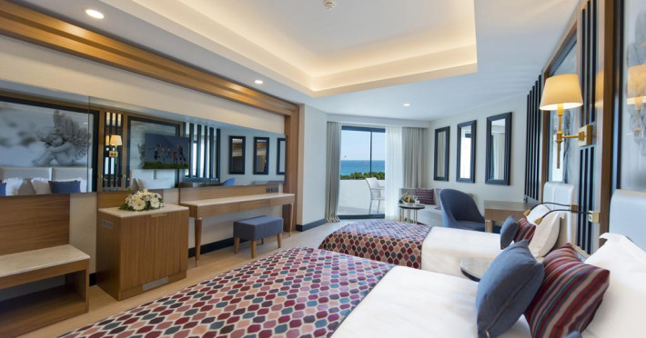 Adalya Elite Lara dispune de camere spatioase modern decorate, in culori calde și oferă o atmosferă prietenoasă. Pentru o relaxare deplina clientii pot alege sa mearga la baia turceasca sau la sauna. Hotelul se afla pe plaja de nisip si pietricele fine.Facilitati camere