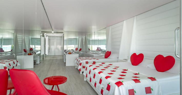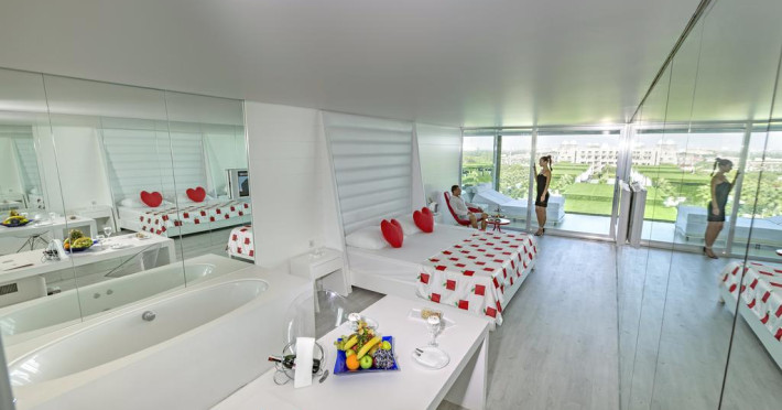 Ada & Eve Resort din Belek iși întampină oaspeții cu un decor luminos și futurist. Amplasat într-o pădure de 100.000 mp la malul mării, hotelul a fost deschis în 2006, însă ultima renovare a avut loc în 2014. Este lider in Europa la categoria „Cel mai bun hotel pentru cupluri”. Camere neobisnuite, albe, cu oglinzi si iluminare multicolora. Hotelul nu accepta copii sub 16 ani.Localizare