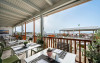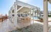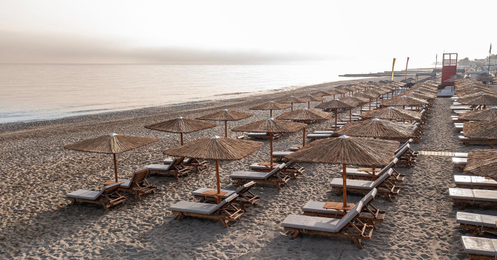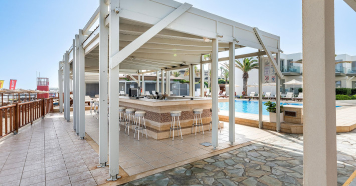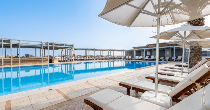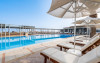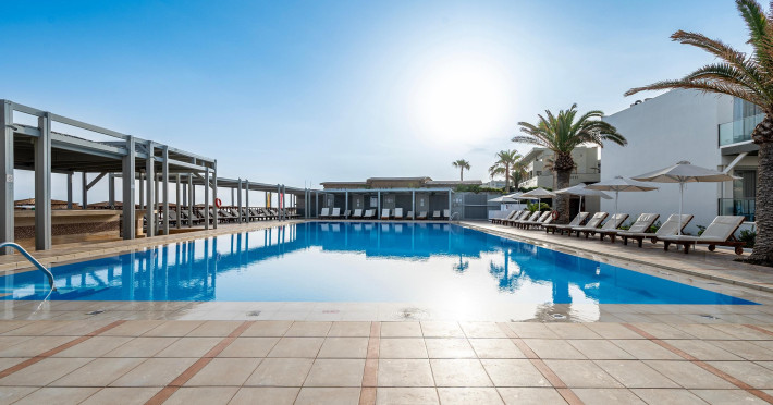 Large swimming pool with sea water at the beachfront. The Pool Bar is the perfect spot to soak up some Greek sun while enjoying fresh snacks, delicious ice creams and refreshing drinks.Start your day with a delicious coffee, a tea or a fresh healthy juice and relax on a lounge chair by the sparkling waters of the pool with a frozen cocktail in the afternoon.After sunset, the hotel Pool Bar is transformed into a romantic setting where the guests can enjoy the sunset and the breathtaking view to the Aegean Sea. The sunset view can please even the most discerning traveler, with a choice of beautiful scenery created by the combination of the gardens, the pool and the Aegean Sea.