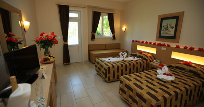 Camerele de la Adora Golf Resort sunt spatioase si au balcon privat, majoritatea fiind cu vedere la Marea Mediterana. Toate camerele au TV prin satelit, minibar si baie privata. La sosire, in camere, este oferit un cos cu fructe.