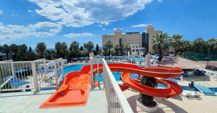 In the vicinity of the hotel`s own sandy beach is located the hotel Adriatik Hotel. There is a 24h shuttle between the hotel and the airport 24h a day. The beach is patrolled by a lifeguard and awarded a blue flag, pets are allowed. Here, there are sun loungers, cushions and beach towels available. Cold drinks are served at the beach bar. The air-conditioned hotel has a lobby, Wi-Fi, internet access, 2 lifts, a shop, a hairdresser, a jacuzzi, a first aid kit, parking spaces as well as a TV lounge with satellite TV. In the outdoor area you will find a garden as well as a seasonally heated and supervised salt water pool that is open seasonally, where sun loungers, sun umbrellas and pool towels are available for free. For children there is also a separate children's pool with a water slide (type twister/open slide). Furthermore, you can relax outdoors on a terrace. Inside the hotel you can use a heated indoor pool. You can store your valuables in the safe, and your luggage in the hotel`s storage room. Check-in is possible around the clock. In addition, the hotel Adriatik Hotel is video-monitored 24h a day. For your entertainment, the hotel offers a casino. You can spend social time at the beach club. For the young hotel guests there is a playground. For very young guests, kid`s chairs can also be provided. There is also a laundry and ironing service. Ironing equipment can also be borrowed at the hotel. For your comfort the hotel page will ensure you are looked after. If necessary, you can contact the medical centre at any time. For conventions and other business meetings, the hotel offers a conference area with a total of 300 seats, tables, overhead projector, internet access as well as a catering service. A photographer can also be ordered from the hotel for business events. For guests on their honeymoon, the hotel has special offers such as a romantically-decorated room, personalised rooms/articles, rooms with a particularly romantic location and view, special honeymoon packages, romantic dishes in the restaurant, champagne, sparkling wine, a present, a basket of fruit or flowers in the room. In your hotel, a lot of focus is placed on sustainability. This includes the provision of soap, shampoo and lotion dispensers, organic food and ecological meals, a central room air-conditioning and environmentally-friendly cleaning. That is why the hotel Adriatik Hotel was also awarded a sustainability certificate. American Express, Euro/Master Card and EC cards are accepted as means of payment. Due to its barrier-free facilities , such as an automatic hotel door, barrier-free entrances, a wheelchair accessible lift and wheelchair-accessible bathrooms, the hotel is also suitable for wheelchair users. Catering As catering services the hotel offers half board, breakfast only and self-catering. Breakfast is offered American, continental, from the buffet or à la carte (extras on request). Lunch and dinner are also served as a set meal or à la carte with starters, salads and desserts (extras on request and at extra cost). Half board includes lunch and dinner. When booking half board plus, lunch is included. When booking all-inclusive, one welcome drink and one meal in the à la carte restaurant are included. As part of the all-inclusive service, water (24h) as well as coffee and tea (24h) are available at no extra charge. For the meals, there are a buffet restaurant with terrace (Mediterranean, calorie-reduced, gluten-free and vegetarian dishes) and several bars, the cafeteria as well as the pool bar. The drinks menu of the hotel includes water, soft drinks, coffee and tea, beer, wine and 24h international alcoholic beverages. Alcoholic beverages are not served in the hotel. Sports & Leisure A tennis court are waiting for your visit. For cyclists there is a storage room. A sauna and a wellness shower await you in the hotel`s own spa area. The hotel also offers massages and beauty treatments. Let yourself be pampered in the Hamam. Spend some healthy and relaxing hours with hot stone therapy. For child care there is a babysitter service in your place of accommodation. In terms of adult entertainment, live music is presented on certain days. Additional information The hotel, built in 1957 and last renovated in 2018, has a total of 70 rooms. One of these rooms offers disabled access. This hotel is gay-friendly. The hotel staff speak English, French, Italian and Turkish.In the vicinity of the hotel`s own sandy beach is located the hotel Adriatik Hotel. There is a 24h shuttle between the hotel and the airport 24h a day. The beach is patrolled by a lifeguard and awarded a blue flag, pets are allowed. Here, there are sun loungers, cushions and beach towels available. Cold drinks are served at the beach bar. The air-conditioned hotel has a lobby, Wi-Fi, internet access, 2 lifts, a shop, a hairdresser, a jacuzzi, a first aid kit, parking spaces as well as a TV lounge with satellite TV. In the outdoor area you will find a garden as well as a seasonally heated and supervised salt water pool that is open seasonally, where sun loungers, sun umbrellas and pool towels are available for free. For children there is also a separate children's pool with a water slide (type twister/open slide). Furthermore, you can relax outdoors on a terrace. Inside the hotel you can use a heated indoor pool. You can store your valuables in the safe, and your luggage in the hotel`s storage room. Check-in is possible around the clock. In addition, the hotel Adriatik Hotel is video-monitored 24h a day. For your entertainment, the hotel offers a casino. You can spend social time at the beach club. For the young hotel guests there is a playground. For very young guests, kid`s chairs can also be provided. There is also a laundry and ironing service. Ironing equipment can also be borrowed at the hotel. For your comfort the hotel page will ensure you are looked after. If necessary, you can contact the medical centre at any time. For conventions a