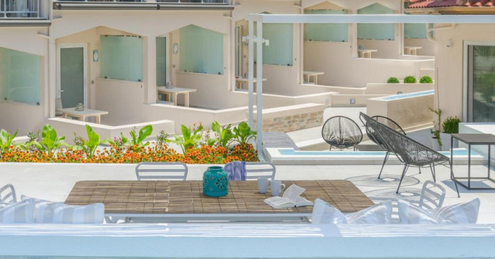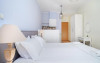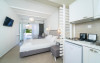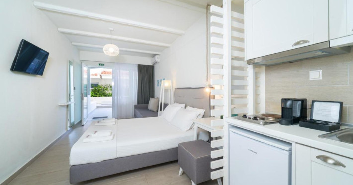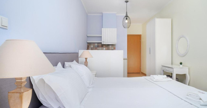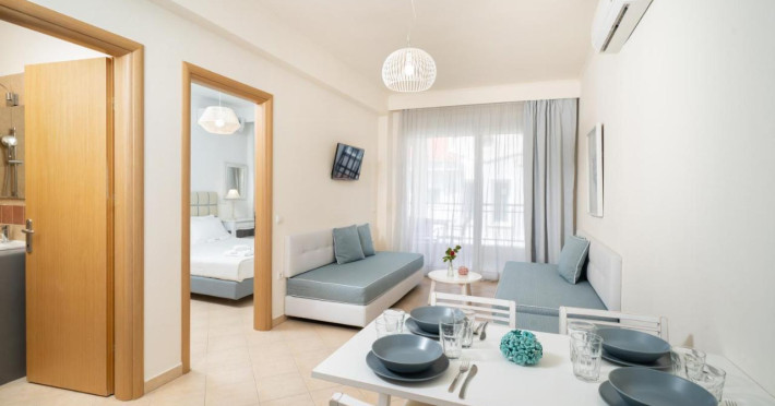 Proprietatea oferă unități de cazare în sistem self-catering cu acces gratuit la internet Wi-Fi și balcon privat.Studiourile şi apartamentele cu aer condiționat de la Aelia au mobilier modern, decor în culori pastelate, saltea și lenjerie de pat marca Coco-Mat și vedere parțială la Marea Egee, la grădină sau la munte. Fiecare unitate de cazare include o chicinetă bine utilată, cu frigider, plită și fierbător și o zonă de luat masa, iar unele au și zonă de relaxare. Băile sunt moderne și includ duș sau cadă şi articole de toaletă gratuite.