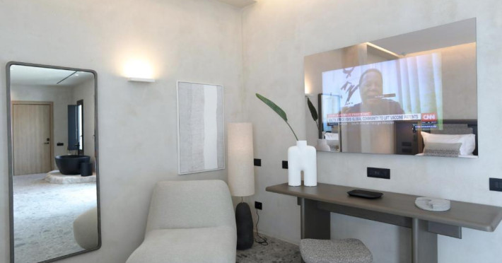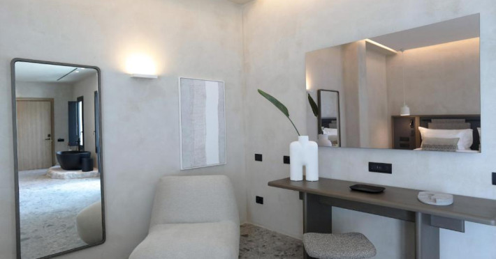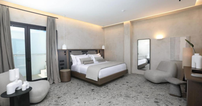 Camerele hotelului sunt prevăzute cu aer condiționat, dulap, aparat de cafea, minibar, seif, TV cu ecran plat și baie privată cu duș. In fiecare cameră există fierbător. Unele camere au balcon, iar altele oferă vedere la mare. In toate camerele de la Aeonic Suites and Spa se asigură lenjerie de pat și prosoape.