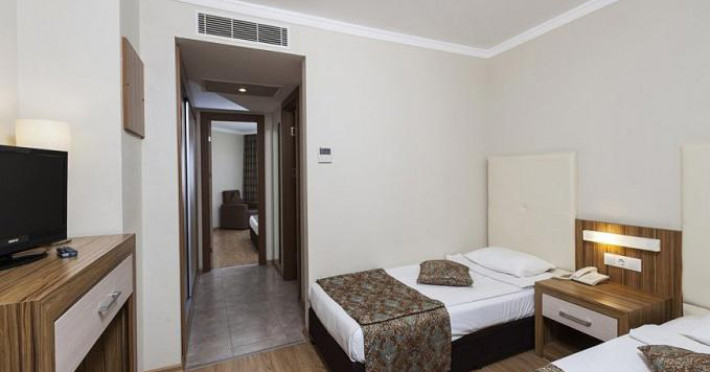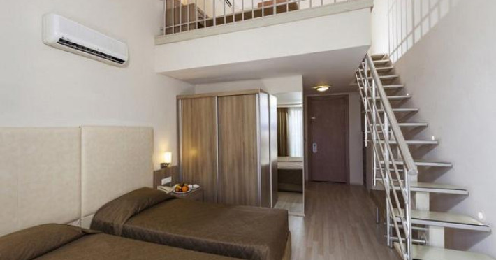 Apartamentele sunt formate din living (canapea extensibila) + dormitor (pat matrimonial), grup sanitar propriu cu uscator de par, TV cablu, minibar, aer conditionat, telefon, incalzire centralizata, acces Internet, acces pe baza de cartela, terasa cu scaune si masuta. Vedere direct spre mare.