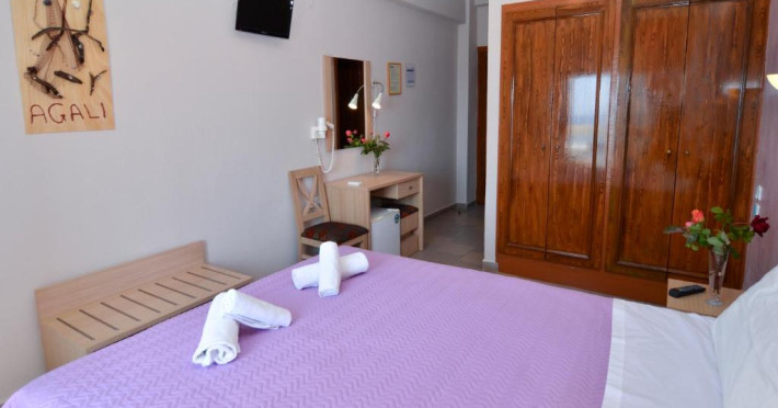 Unele camere au balcon, cu vedere la piscină, unde oaspeții se pot relaxa în voie. În camere există baie cu cadă sau duș prevăzută cu foehn. Oaspeții au la dispoziție serviciul de room service pentru a servi masa sau diverse băuturi. Camerele confortabile de la Agali au pardoseală de gresie/ marmură, aer condiționat, Tv cu canale prin satelit și seif. Oaspeții au acces gratuit la serviciul Wi-fi în camere. Curățenia in cameră se face zilnic. Fiecare unitate de cazare are frigider. Proprietatea oferă camere pentru familie cu o suprafață mai mare și un număr mai mare de paturi față de cele standard. Se pot rezerva de asemenea camere pentru nefumători.