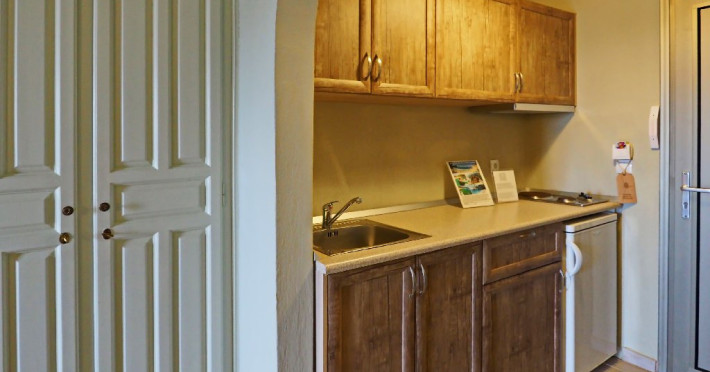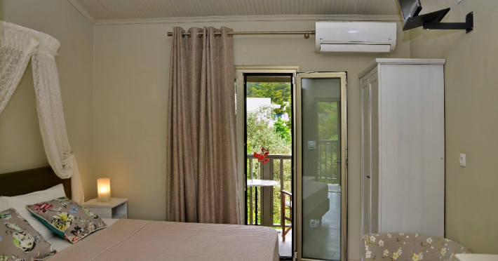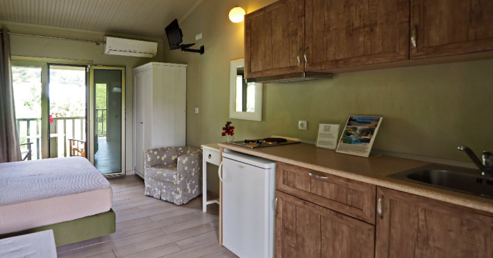 - Camerele duble studio tip double twin ground floor se afla la parterul vilei si sunt dotate cu TV, baie, aer conditionat si chicineta dotata cu mini frigider, plita electrica, hota si vesela.