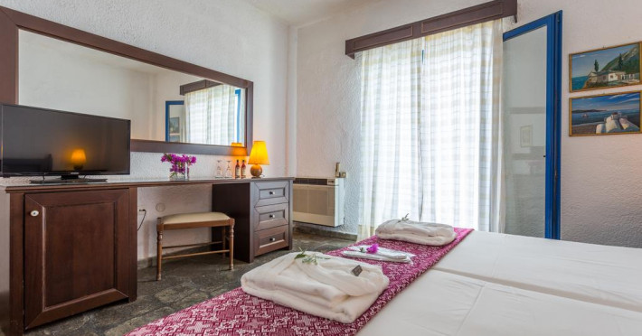Sunt disponibile 69 camere. Fiecare cameră dispune de minibar și cană-fierbător. Oaspeții pot solicita serviciul de room service pentru a servi masa sau diverse băuturi. Unele camere au balcon cu vedere la mare sau la grădină. Camerele confortabile de la Agionissi Resort au pardoseală de gresie/ marmură, aer condiționat, Tv cu canale prin satelit și seif. În camere există baie cu cadă sau duș ce are în dotare foehn și articole de toaletă gratuite. Curățenia in cameră se face zilnic. Proprietatea oferă camere pentru familie cu o suprafață mai mare și un număr mai mare de paturi față de cele standard.