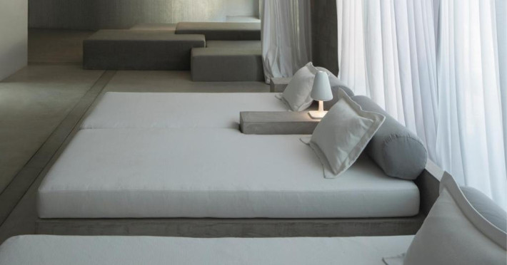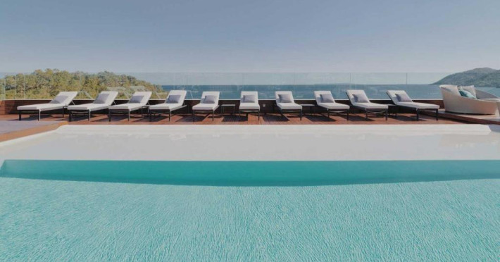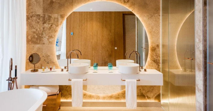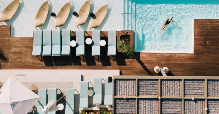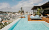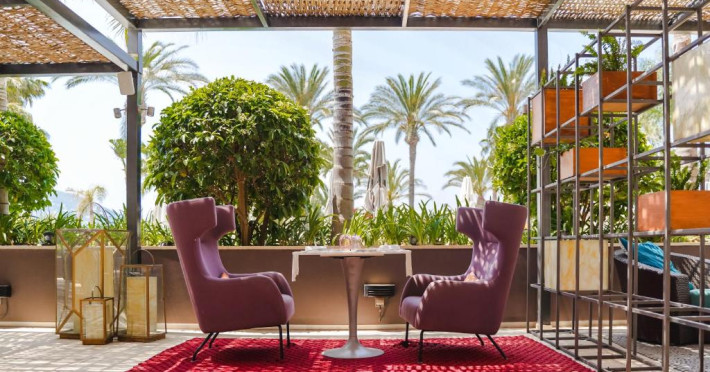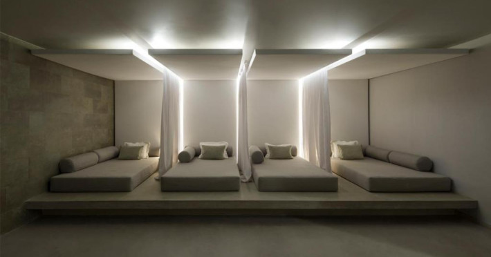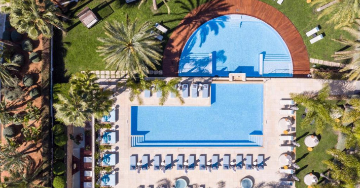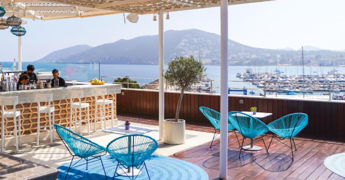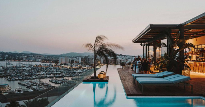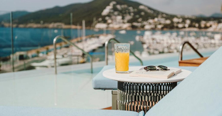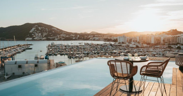 Aguas de Ibiza Grand Luxe Hotel - Small Luxury Hotel of the World este un hotel de design de lux, cu un centru spa gratuit și piscină in aer liber. Hotelul are un bar cu terasă pe acoperiș, destinat exclusiv adulților, cu vedere la portul de acord Santa Eulalia și la insula Formentera.