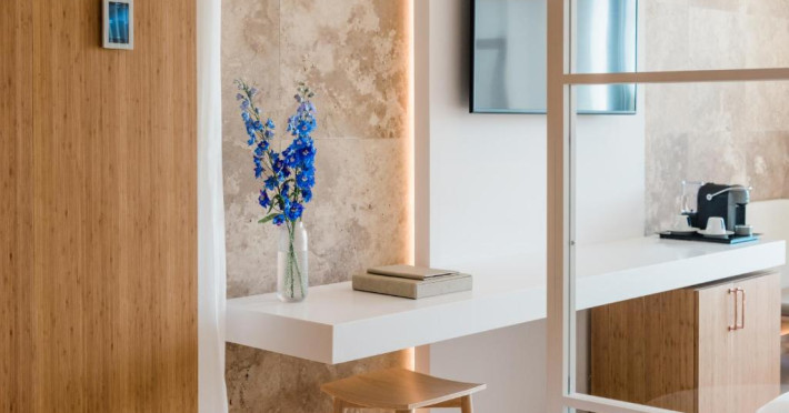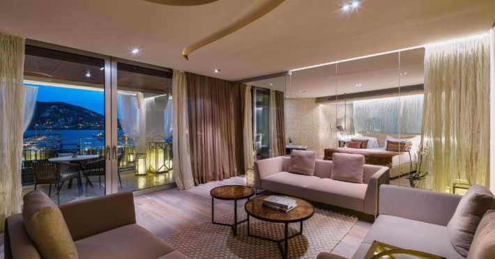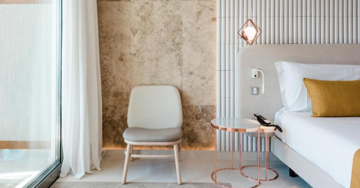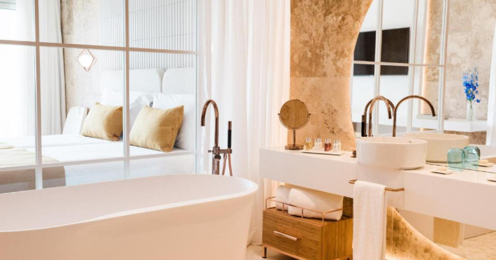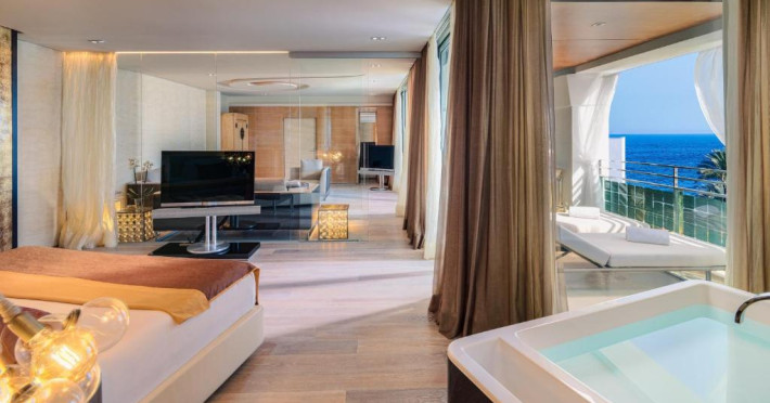 Camerele elegante de la Aguas de Ibiza Grand Luxe Hotel - Small Luxury Hotel of the World au internet gratuit, TV cu ecran de 50 inch și o terasă privată, majoritatea cu vedere la mare. Băile moderne sunt dotate cu mobilier din piatră naturală, halat de baie și papuci. Oaspeții beneficiază de acces gratuit la internet WiFi de mare viteză.