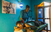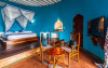 Camerele au paturi sculptate din lemn, aer conditionat, facilități pentru prepararea de ceai si cafea si baie privată, dotată cu dus.