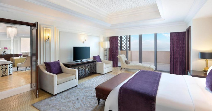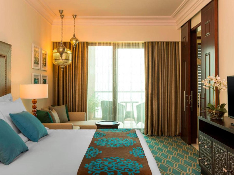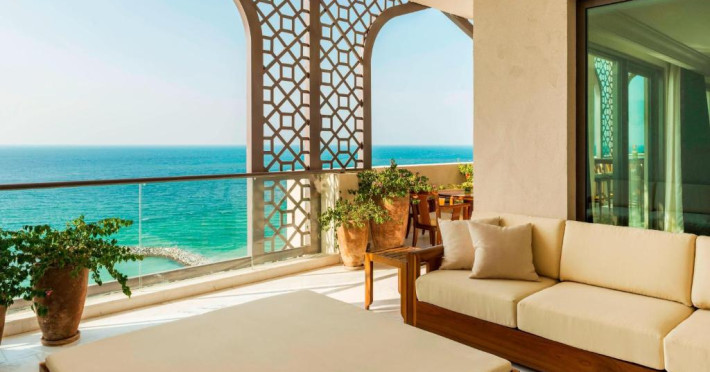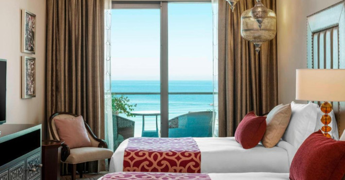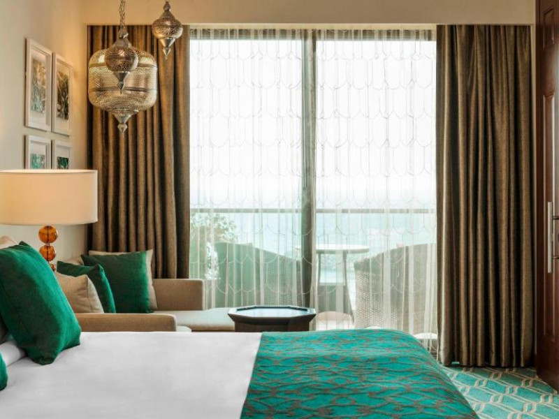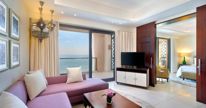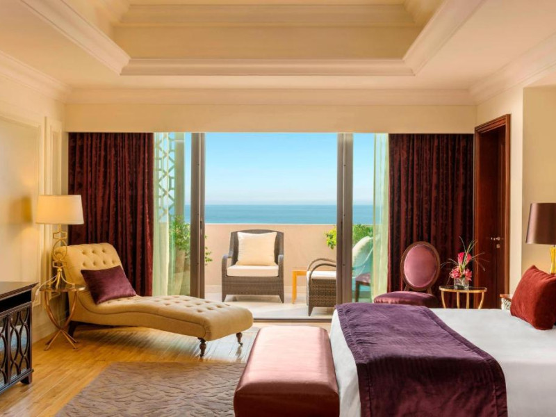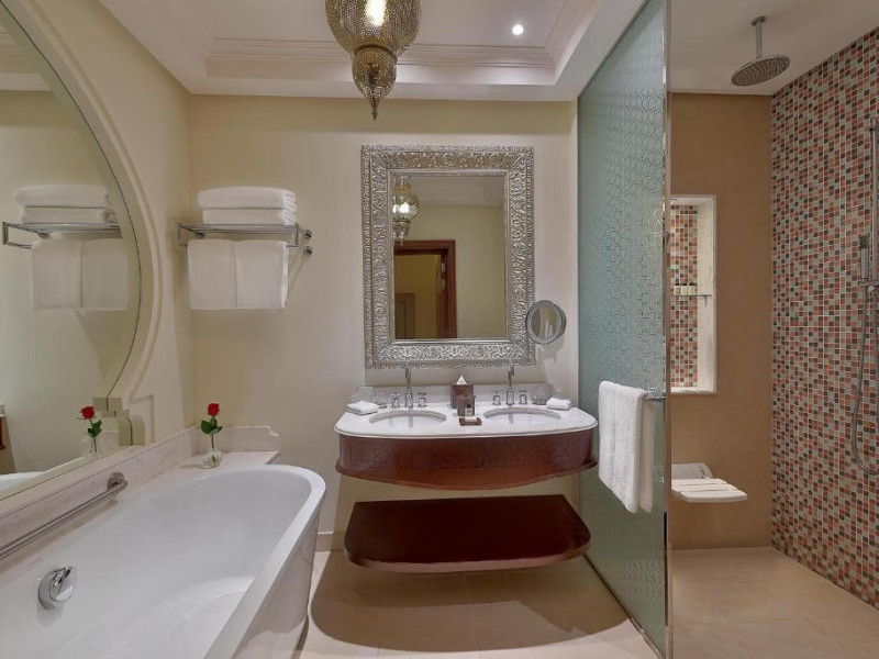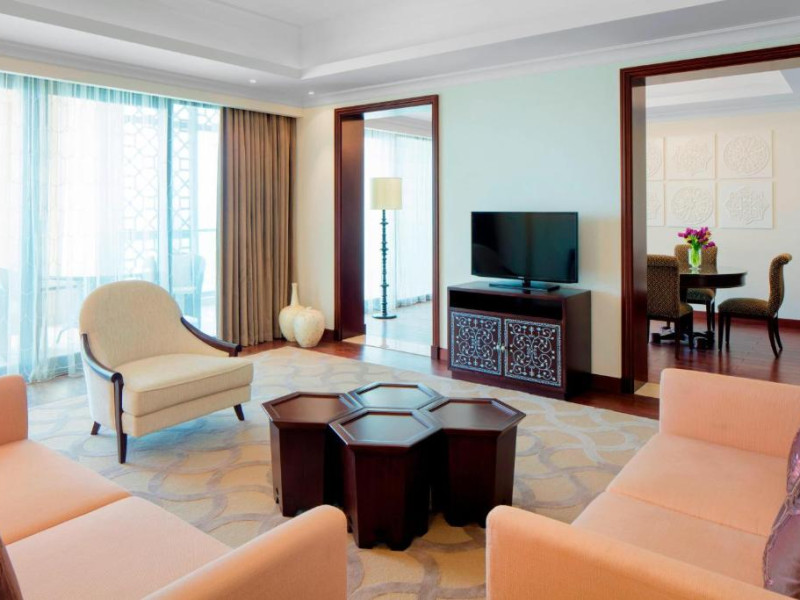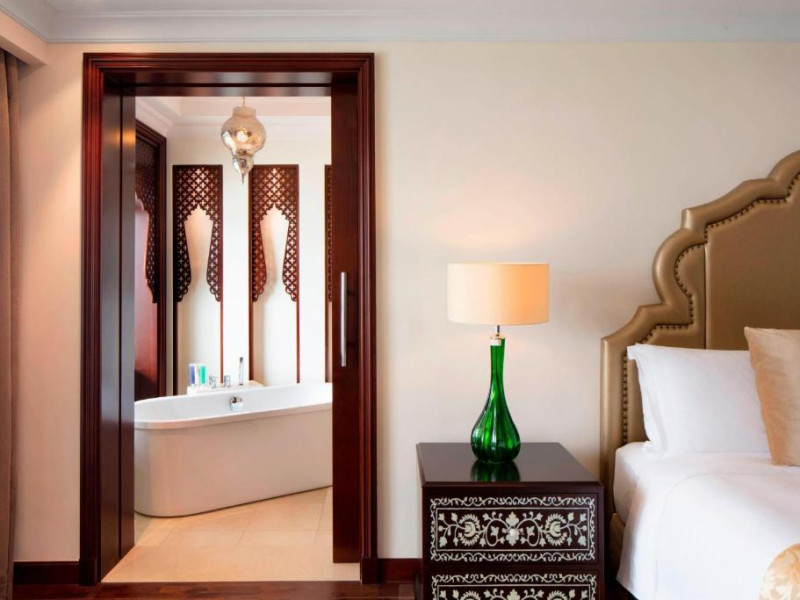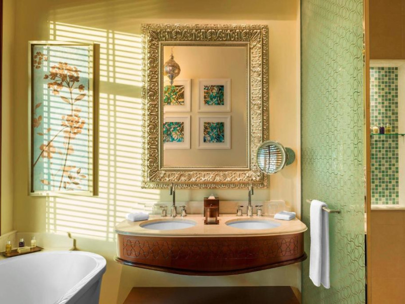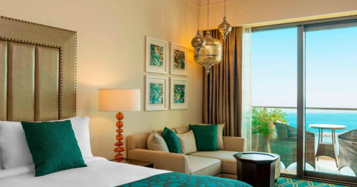 Ajman Saray oferă 205 camere și suite spațioase, cu vederi uimitoare asupra Golfului Persic și a paraului. Fiecare oferă balcon, televizor cu ecran plat și docking station pentru iPod. Suita include un living cu masă. Baia este dotată cu cadă și duș.