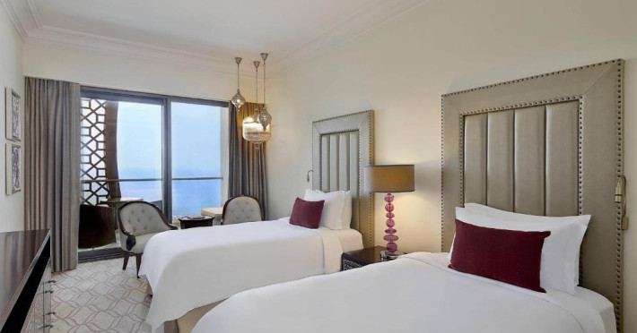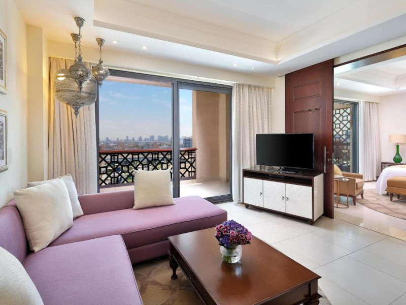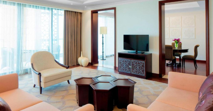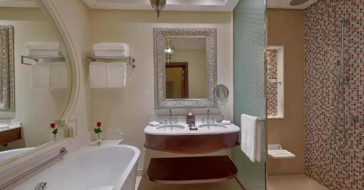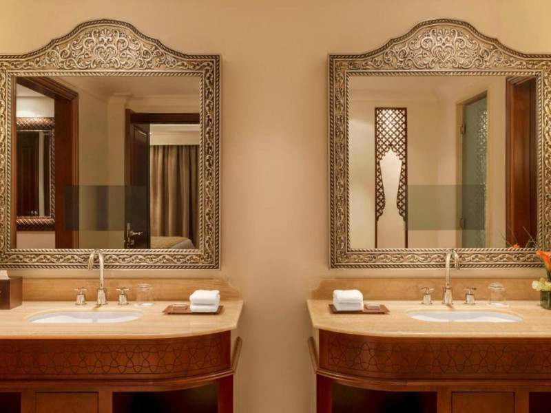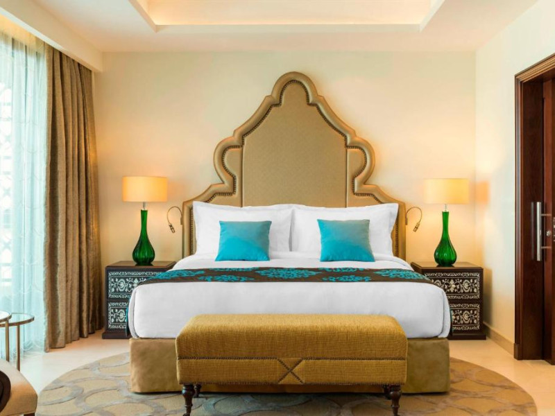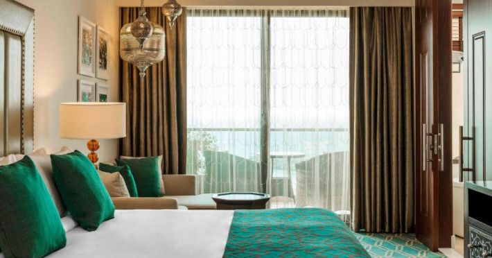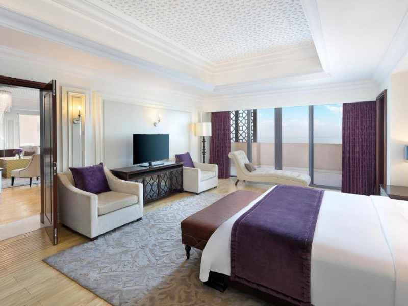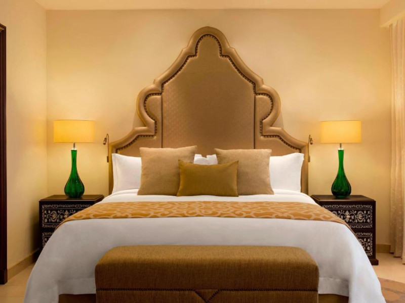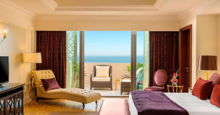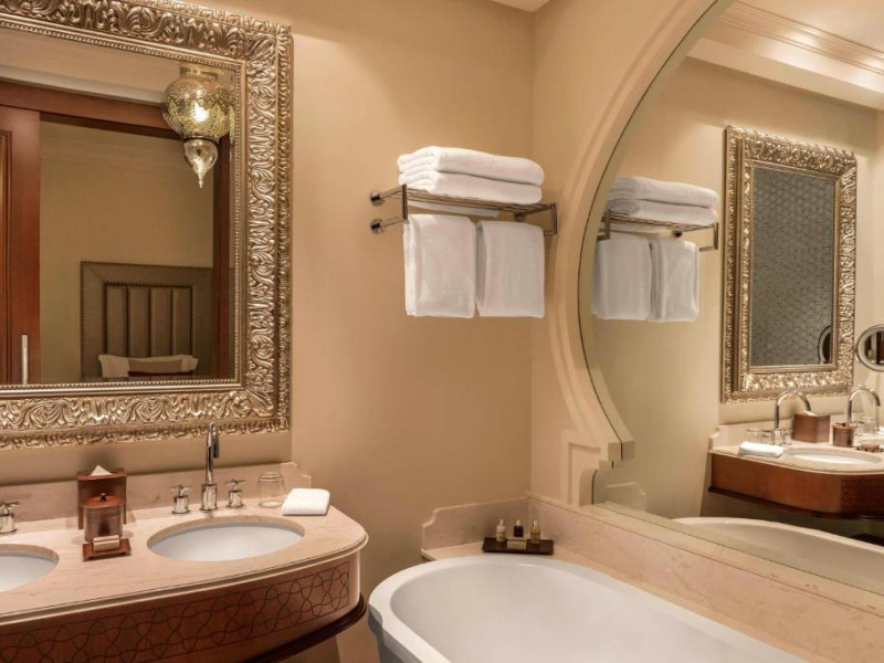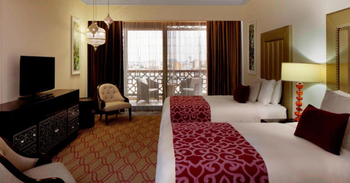 Ajman Saray oferă 205 camere și suite spațioase, cu vederi uimitoare asupra Golfului Persic și a paraului. Fiecare oferă balcon, televizor cu ecran plat și docking station pentru iPod. Suita include un living cu masă. Baia este dotată cu cadă și duș.