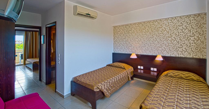 Sunt disponibile 335 camere. Camerele confortabile de la Akti Beach Club au pardoseală de gresie/ marmură, aer condiționat, Tv cu canale prin satelit și seif. În camere există baie cu cadă sau duș prevăzută cu foehn. Camerele au balcon cu vedere la grădină. Oaspeții au acces la serviciul Wi-fi în camere contra cost. Curățenia in cameră se face zilnic. Există camere care au zonă de relaxare cu canapea, ceea ce asigură un plus de confort și răsfăț. Proprietatea oferă camere pentru familie cu o suprafață mai mare și un număr mai mare de paturi față de cele standard. Se pot rezerva de asemenea camere pentru nefumători.