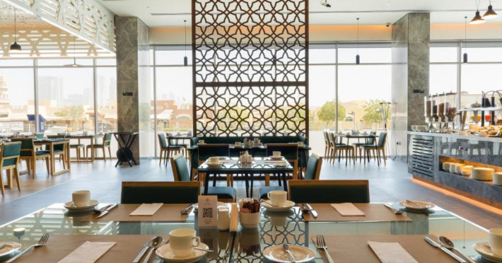 La proprietate poate savura un mic dejun tip bufet, continental sau american. Al Khoory Courtyard Hotel găzduiește un restaurant care servește mancăruri din bucătăria indiană, din Orientul Mijlociu și internațional. La cerere, oaspeții pot beneficia și de preparat vegetariene și halal.