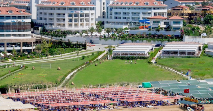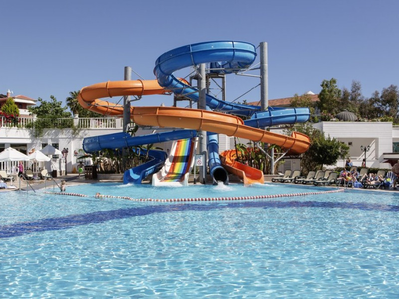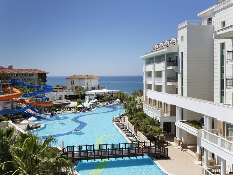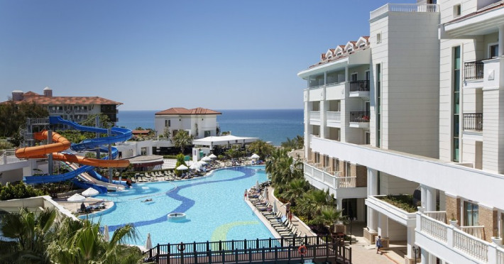 Facilitati hotel: Hotelul ofera oaspetilor sai urmatoarele facilitati: restaurant principal, 2 restaurante a la carte, 5 baruri, internet wi-fi gratuit in lobby, lobby bar si la barul de la piscina, piscina exterioara cu 4 tobogane, piscina pentru copii, piscina interioara, jacuzzi, mini golf, teren de tenis, centru fitness, hamam, sauna, gimnastica, boocia, darts, zumba, voley, fotbal, discoteca, muzica live, programe de animatie, sali de conferinta, mini club, mini disco, diverse activitati pentru copii.