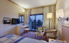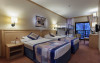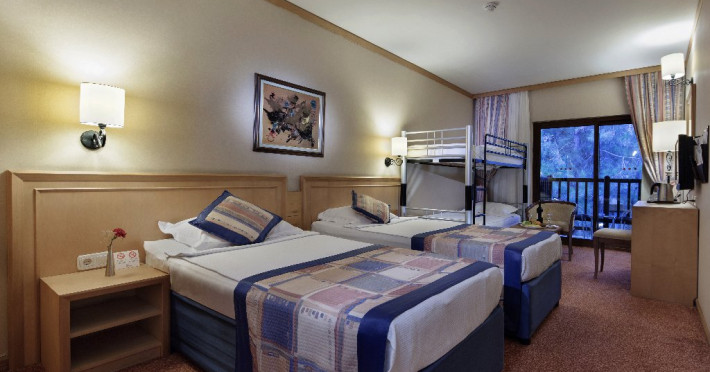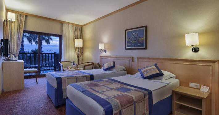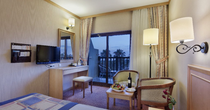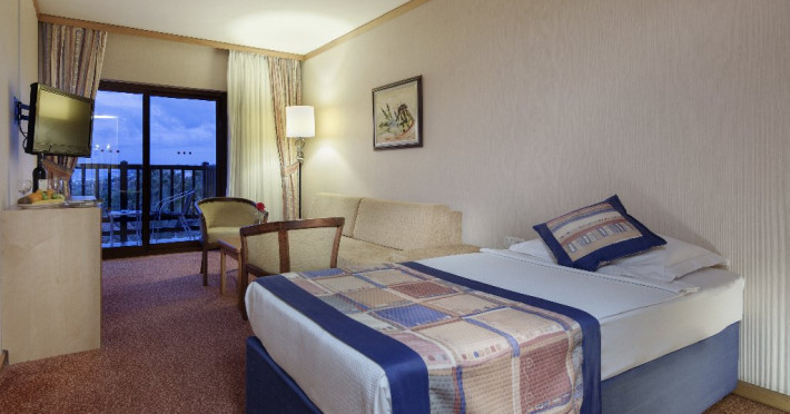 Facilitati camere: Hotelul este alcatuit din 10 cladiri principale, a cate 4 etaje, avand 118 camere standard cu land, sea si partial view (max. 2+1 persoane, 26 mp), 20 camere bunks beds cu land view (max. 2+2 persoane, 25-32 mp), 48 camere family cu land view (max. 2+2 persoane, 41 mp), 36 camere family deluxe cu land si sea view (max. 4+2 persoane, 55 mp) si 4 camere pentru persoanele cu dizabilitati cu land view (max. 2 persoane, 26 mp).