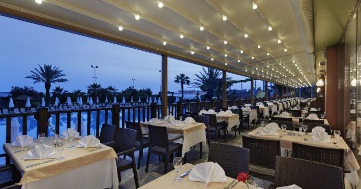 In restaurantul principal micul dejun, pranzul si cina sunt servite in stil bufet suedez, cinele avand diverse teme si specialitati turcesti. Restaurantele a la carte sunt cu specific italienesc si pe baza de peste.