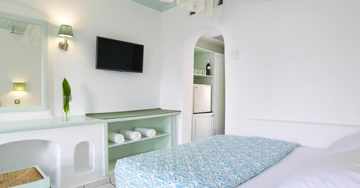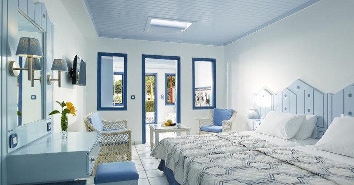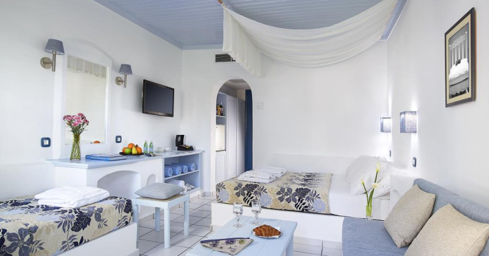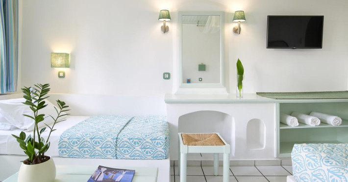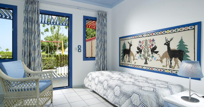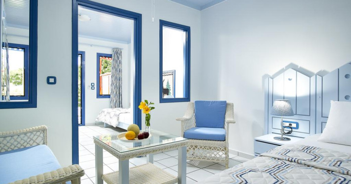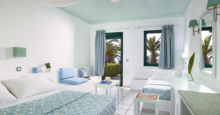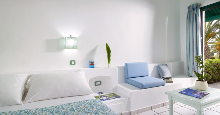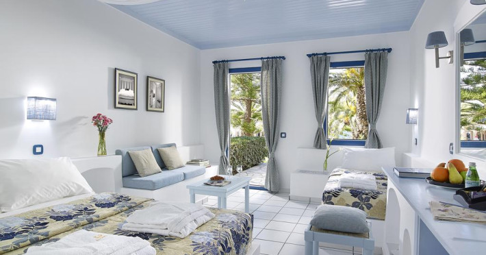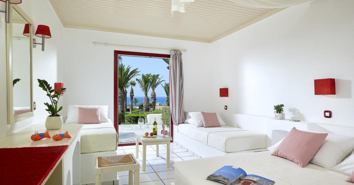 Sunt disponibile 342 camere. Camerele confortabile de la Cretan Village Beach Hotel au pardoseală de gresie/ marmură, aer condiționat, Tv cu canale prin satelit și seif. Fiecare cameră dispune de minibar. Oaspeții pot solicita serviciul de room service pentru a servi masa sau diverse băuturi. Oaspeții au acces gratuit la serviciul Wi-fi în camere. Camerele au balcon cu vedere la mare sau la grădină. În camere există baie cu cadă sau duș ce are în dotare foehn și articole de toaletă gratuite. Curățenia in cameră se face zilnic. Proprietatea oferă camere pentru familie cu o suprafață mai mare și un număr mai mare de paturi față de cele standard. Se pot rezerva de asemenea camere pentru nefumători.
