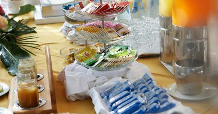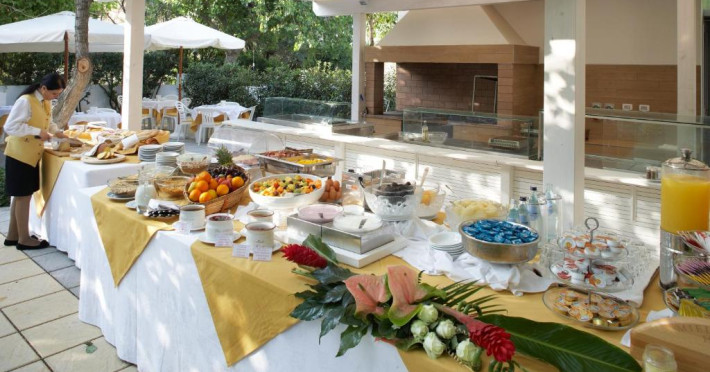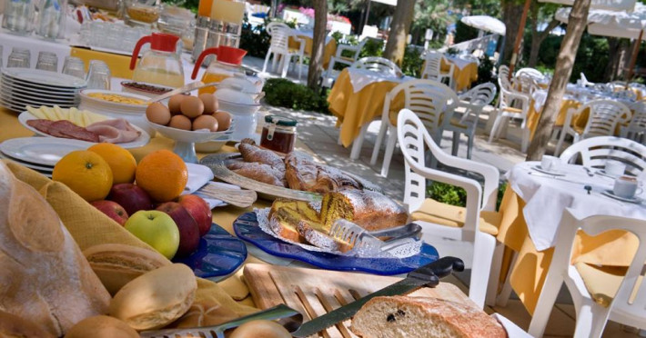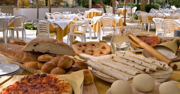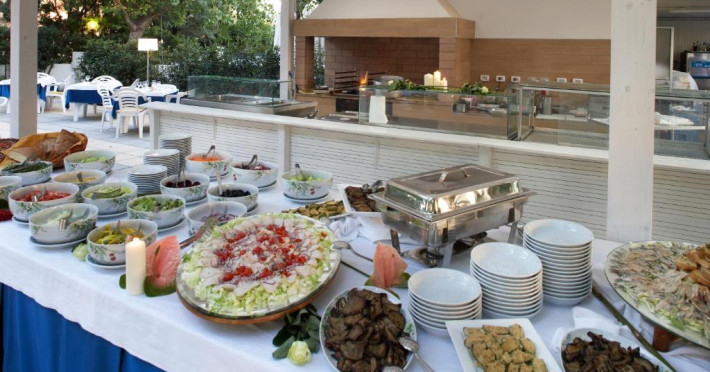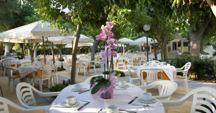 Restaurantul Mistral oferă vedere panoramică la marea albastră. Oaspeții pot savura preparate regionale tradiționale și mancăruri internaționale. De asemenea, in timpul sezonului de vară, hotelul pune la dispozitie restaurantul Oasis, care oferă grădină si grătar.