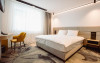 - Deluxe Room with balcony: Camerele Deluxe acomodeaza un numar maxim de doua persoane si sunt dotate cu paturi twin. Camerele Deluxe with balcony au vedere catre centrul orasului Sinaia si sunt dotate cu balcon.