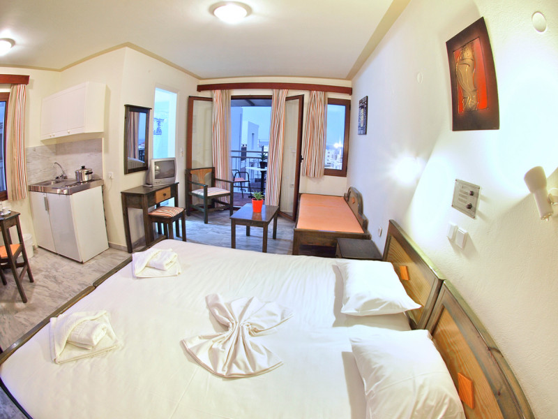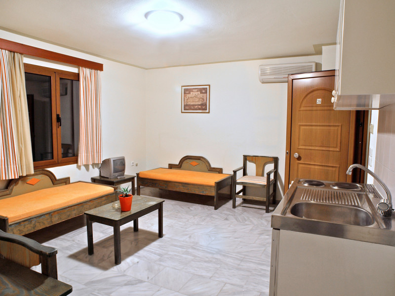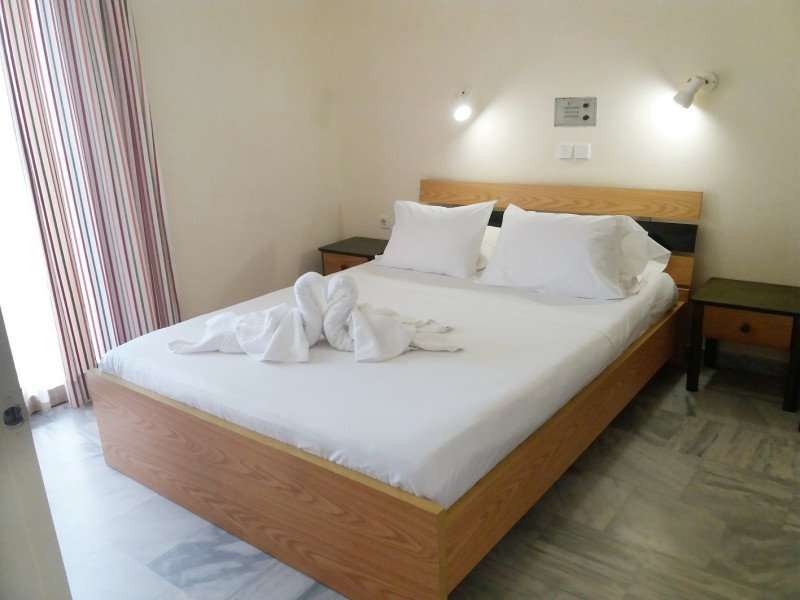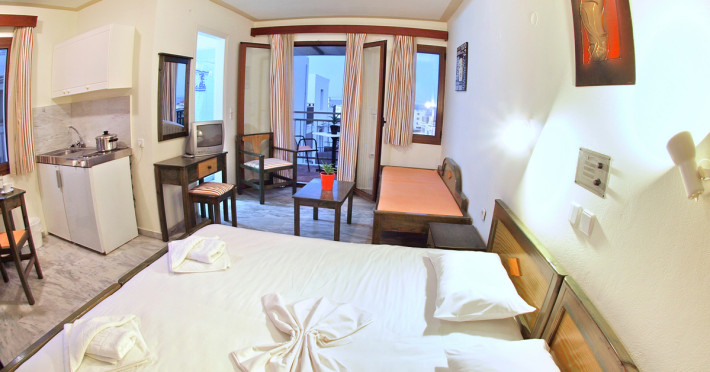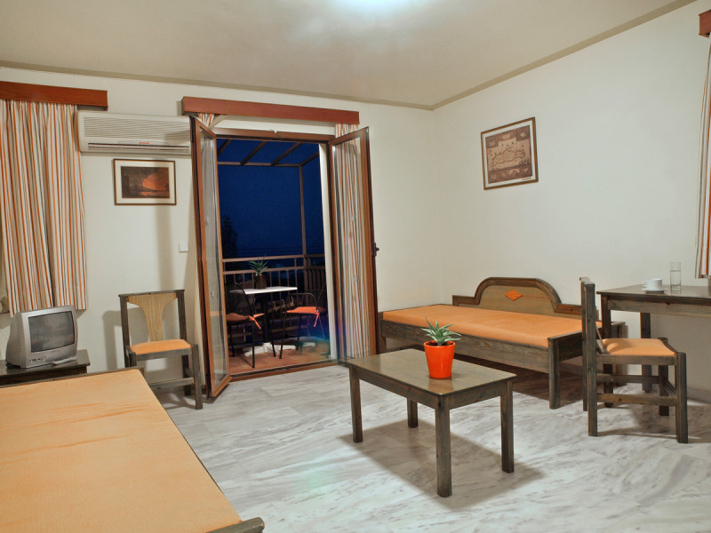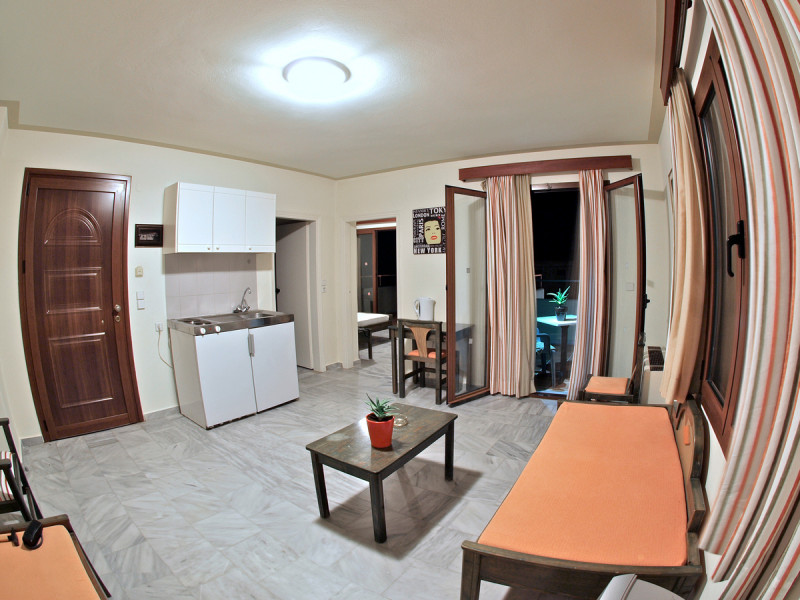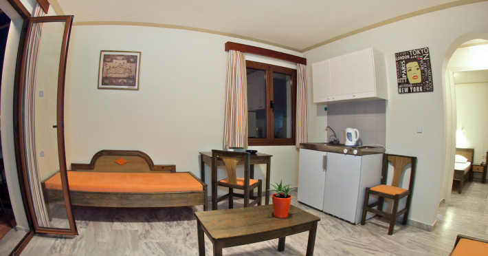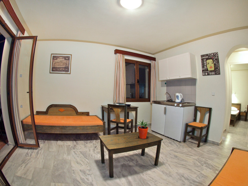 The ALEXANDROS M studios & apartments offers 8 studios for 2 persons, 8 apartments for 4 persons and a suite for 6 people.All have kitchenet,shower,air condition and television. ALEXANROS M also has a swimming pool,children's pool,football field, beach volley and a bar open all day, with snacks and drinks until late at night,At the bar there is satelite TV , dart board and free WI-FI internet in all common areas.In addition, a client library and a large private parking. In our Bar you can find breakfast served.