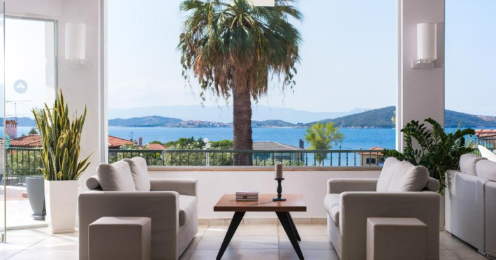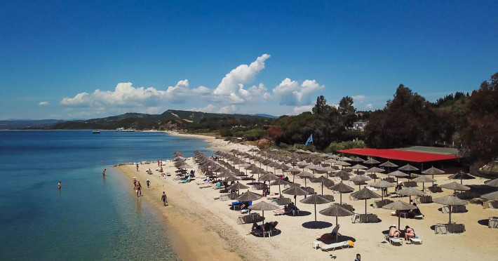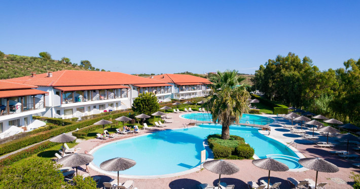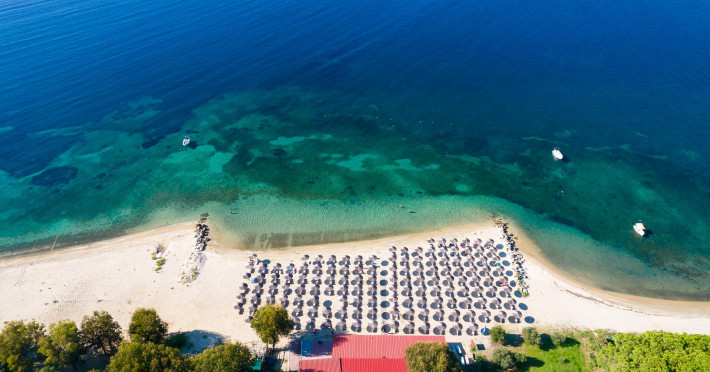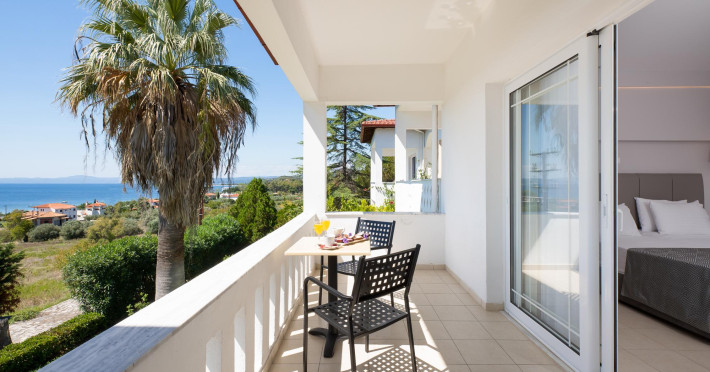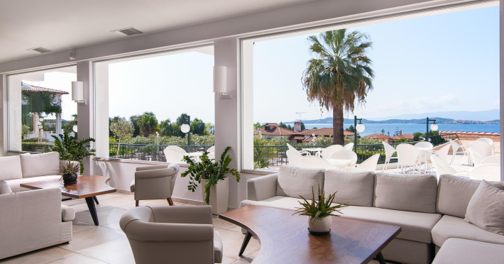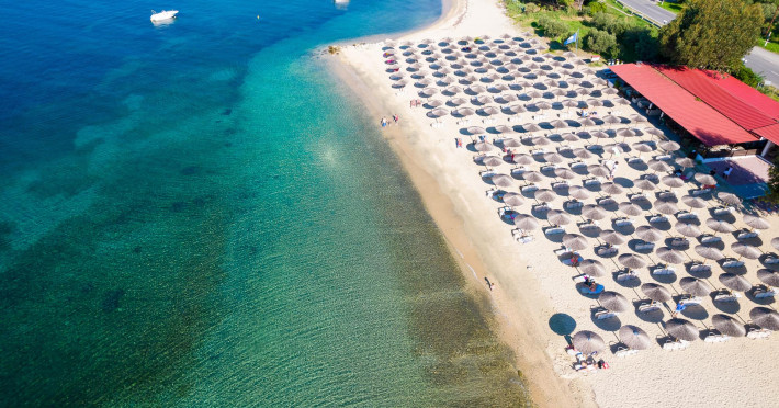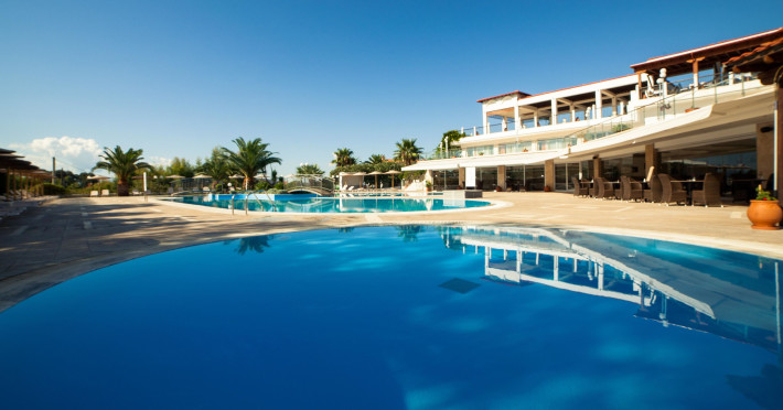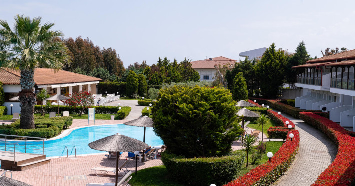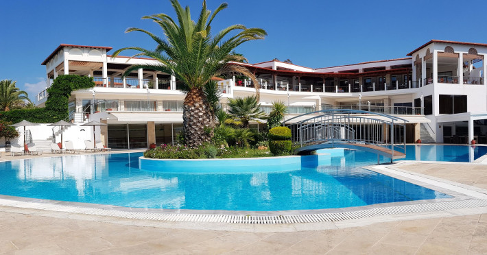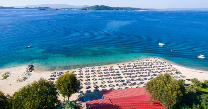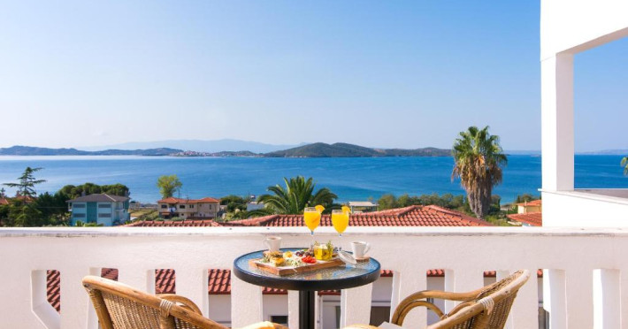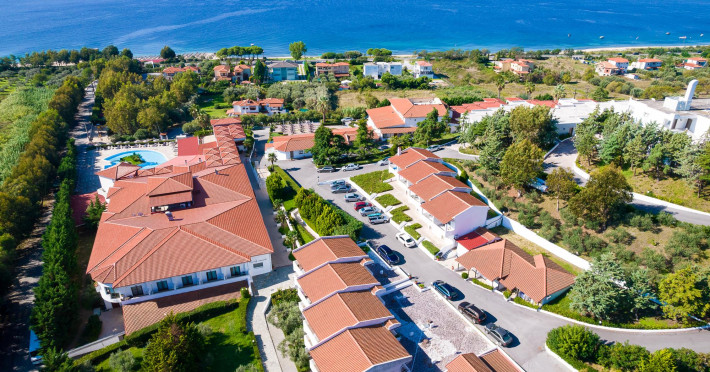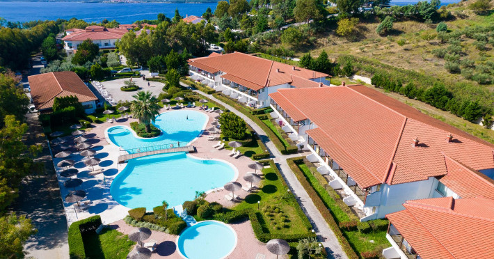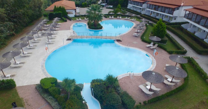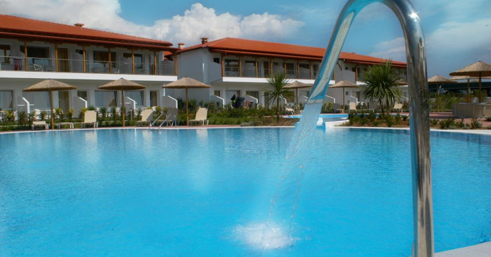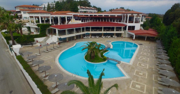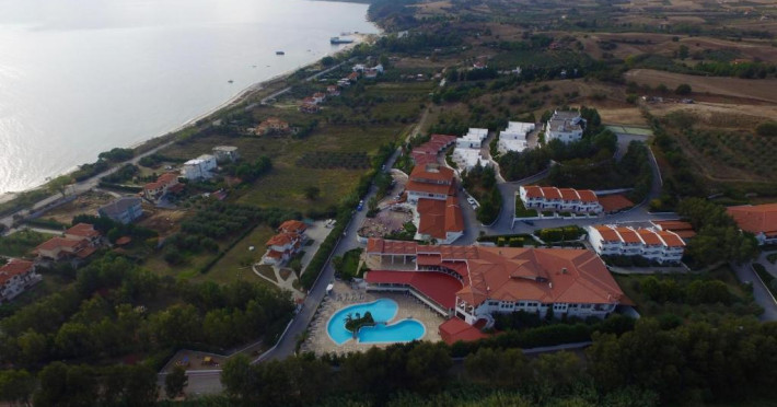 Hotelul spa pentru turiști de la plajă, turiști activi și turiști care fac sport, vacanțieri de la club, familii, celibatari și cei îndrăgostiți de natură, se află la câteva secunde de plaja cu nisip a hotelului, chiar în afara Uranopolisului, până în centrul localității sunt cam 7 km. Stațiile mijloacelor locale de transport în comun se află chiar în fața ușii.