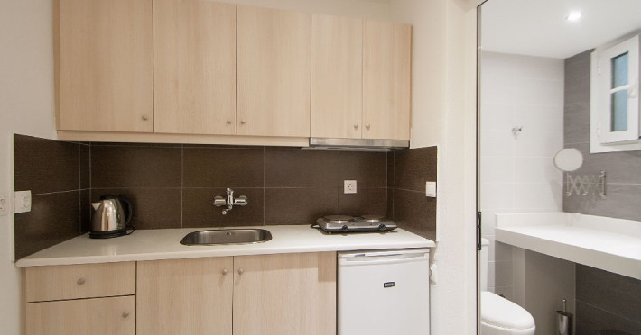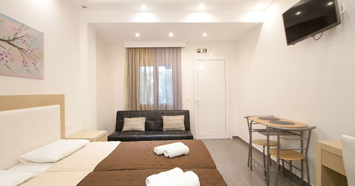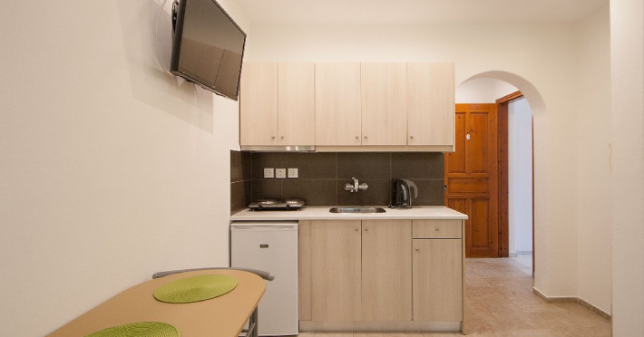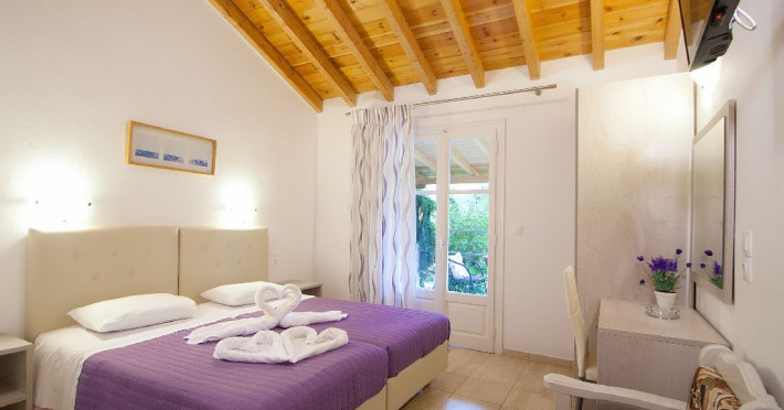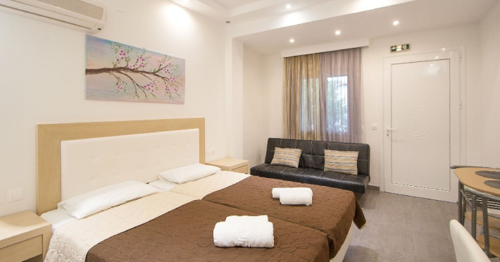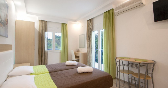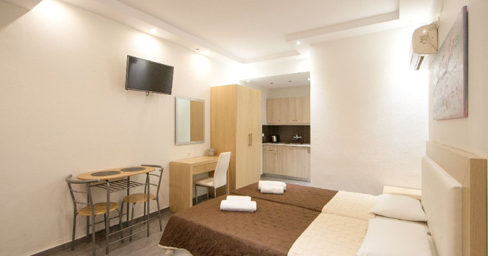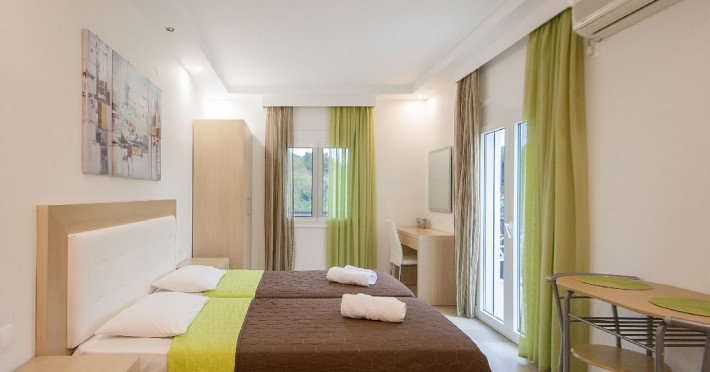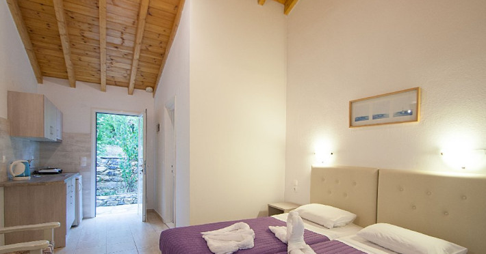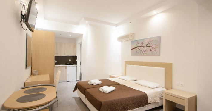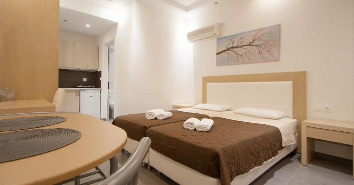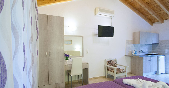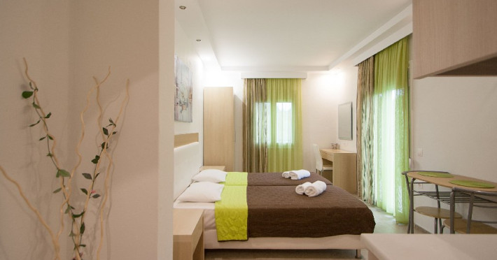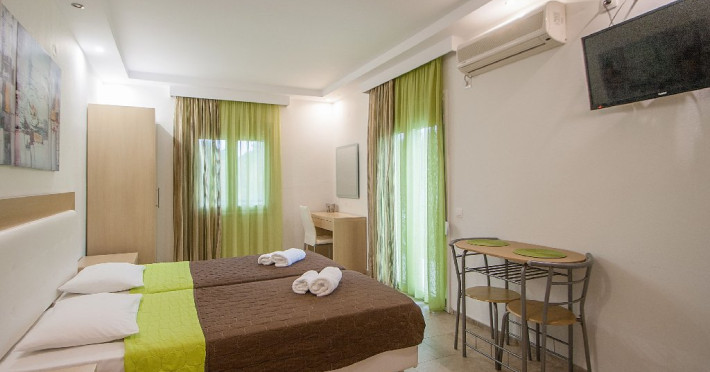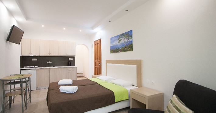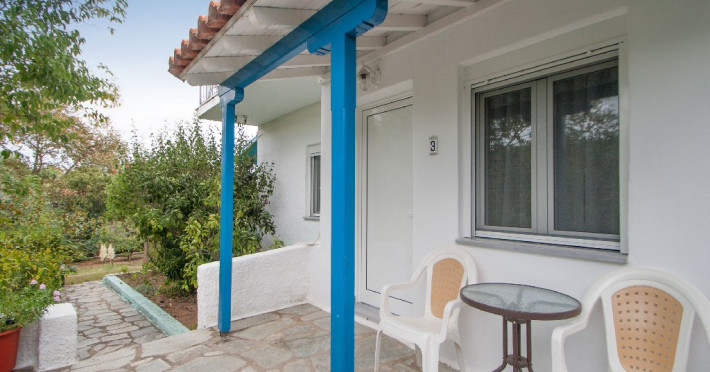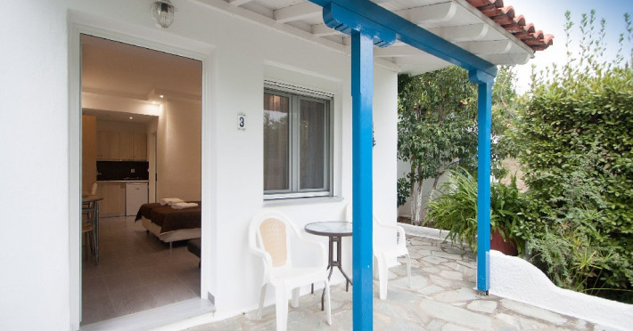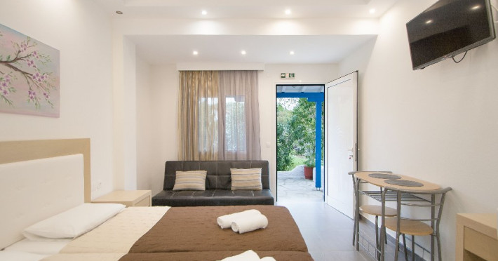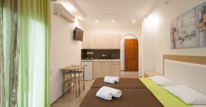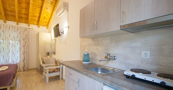 Facilitati vila: Complexul Alexis este compus din doua cladiri amplasate intr-o gradina privata plina de portocali si flori de leandru. Prima cladire dispune de 4 studiouri (Superior) la parter si 3 studiouri (Standard) etajul 1, iar la etajul 2 se afla un apartament cu doua dormitoare (pentru maximum 4 persoane).