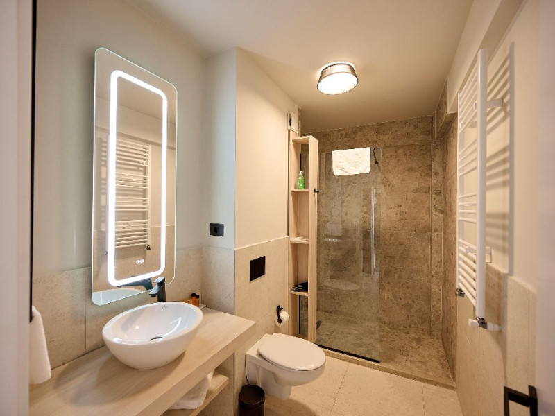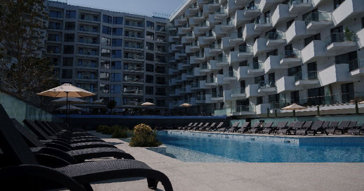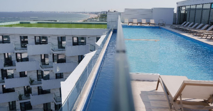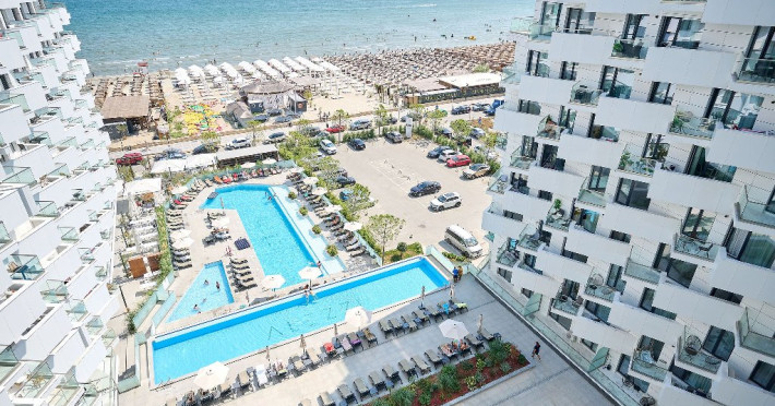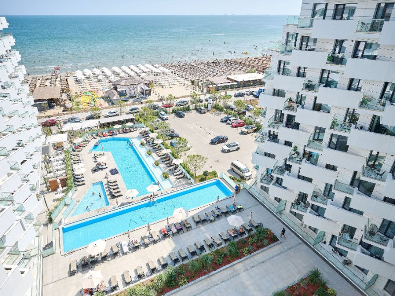 Bucura-te de o varietate de facilitati premium, precum Infinity Bar cu terasa interioara, zona SPA cu jacuzzi, sauna uscata, sala de fitness indoor, terasa pentru jogging, piscina infinity cu terasa amenajata, 3 piscine exterioare pentru adulti si copii, restaurant cu specific italian cu terasa langa piscina, gradina interioara, lounge, receptie disponibila 24h/7, parcare exterioara/interioara si statie de incarcare pentru masini electrice.