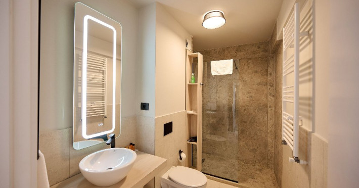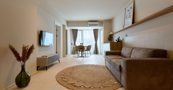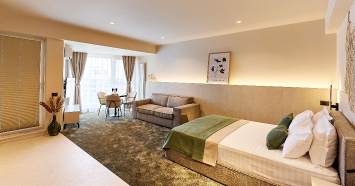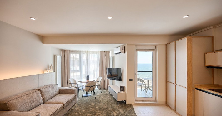 Este compus din dormitor cu pat matrimonial 160/200cm si living cu canapea extensibila, balcon cu scaune si masa, baie cu dus.