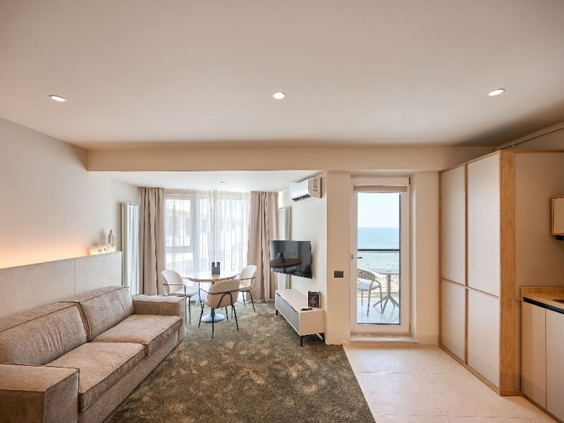 Are vedere lateralA spre mare. Compus din spatiu generos open space cu zona de living cu canapea fixa si 2 dormitoare cu pat matrimonial 160/200cm, baie cu dus, balcon cu scaune si masa.