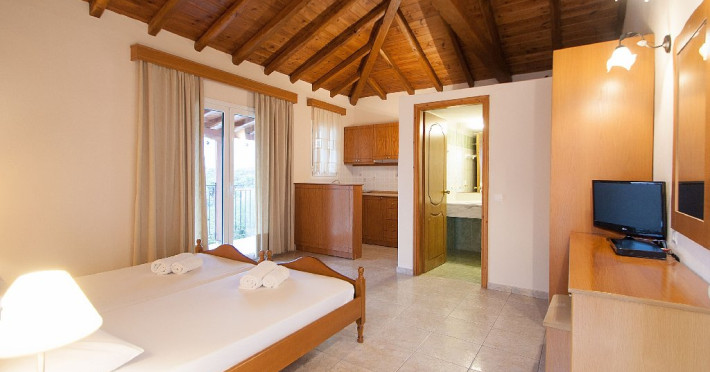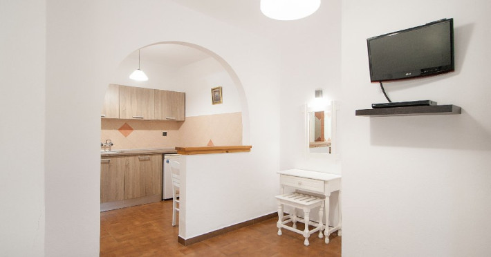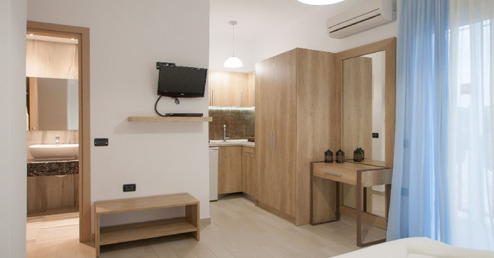 Apartamente Standard: situate la etaj, sunt dotate cu TV plasma 22 inch, DVD player, baie, aer conditionat (pentru care se plateste optional la proprietar 45 euro pe camera/ saptamana), balcon sau terasa si chicineta dotata cu frigider, plita electrica, hota si vesela, baie cu dus.