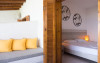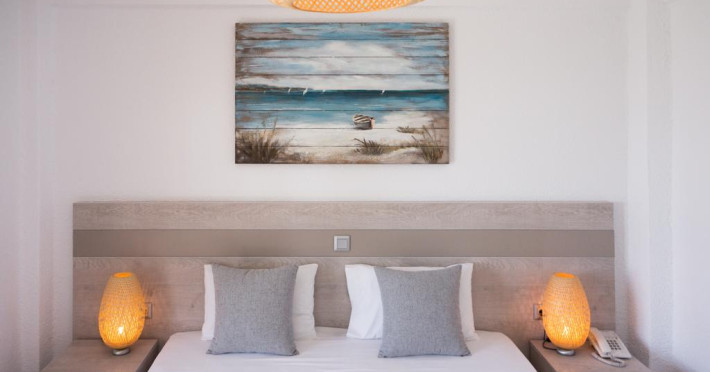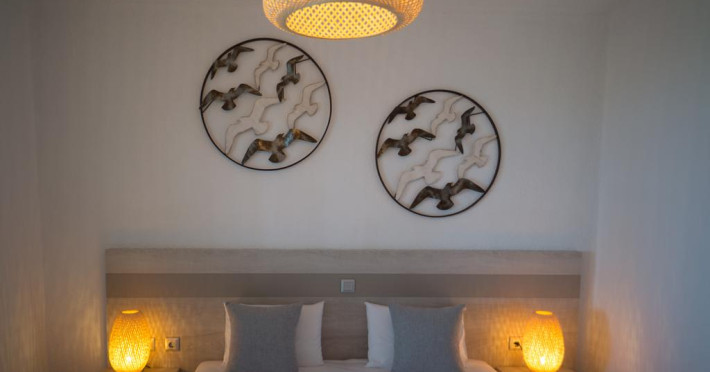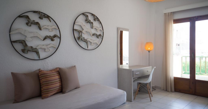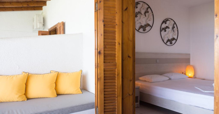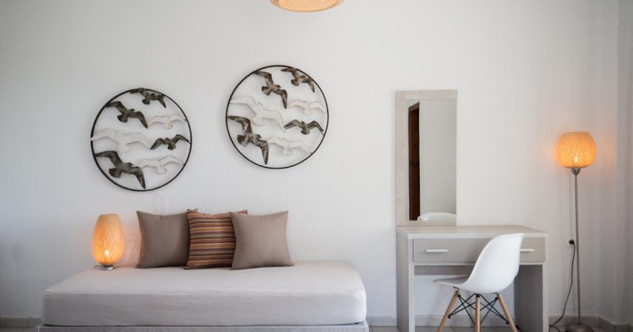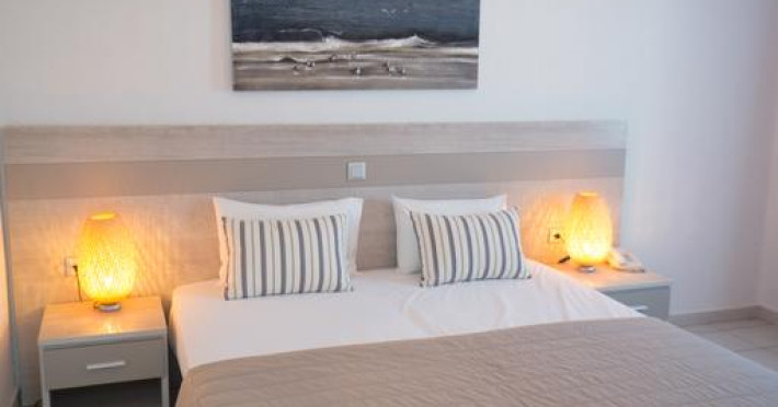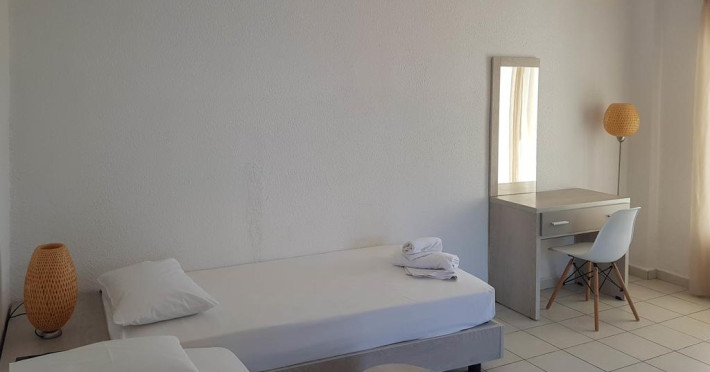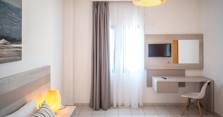 Sunt disponibile 28 camere. Unele camere au balcon cu vedere la mare sau la piscină. În camere există baie cu cadă sau duș prevăzută cu foehn. Camerele de la Alkinoos Beach Hotel sunt dotate cu aer condiționat, Tv cu canale prin satelit și seif. Oaspeții au acces gratuit la serviciul Wi-fi în camere. Curățenia in cameră se face zilnic. Fiecare unitate de cazare include o chicinetă utilată cu frigider și ustensile de bucătărie. Proprietatea oferă camere pentru familie cu o suprafață mai mare și un număr mai mare de paturi față de cele standard. Se pot rezerva de asemenea camere pentru nefumători.