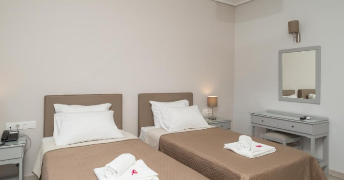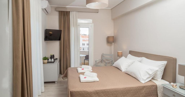Sunt disponibile 50 camere. În camere există baie cu duș ce are în dotare foehn și articole de toaletă gratuite. Camerele luminoase de la Alkyon Hotel sunt dotate cu aer condiționat, Tv și seif. Oaspeții au la dispoziție serviciul de room service pentru a servi masa sau diverse băuturi. Camerele au balcon cu masă și scaune unde pot fi petrecute momente de relaxare. Oaspeții au acces gratuit la serviciul Wi-fi în camere. Curățenia in cameră se face zilnic. Proprietatea oferă camere pentru familie cu o suprafață mai mare și un număr mai mare de paturi față de cele standard.