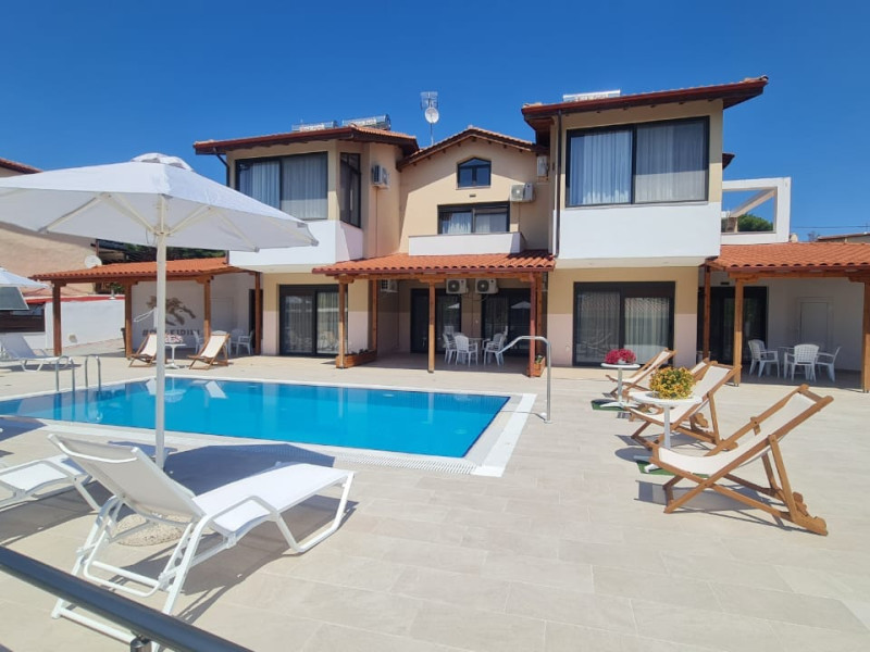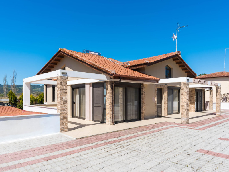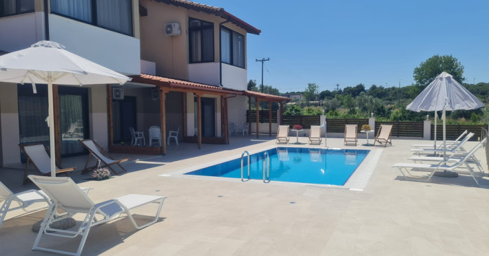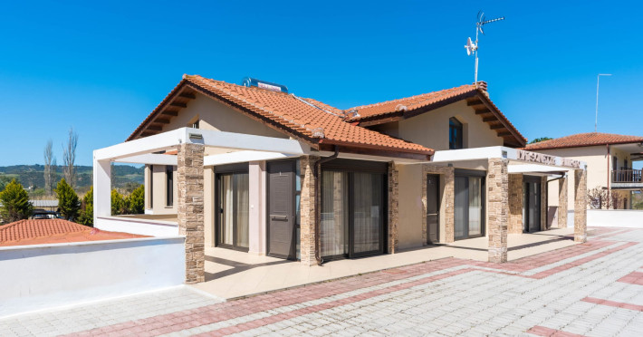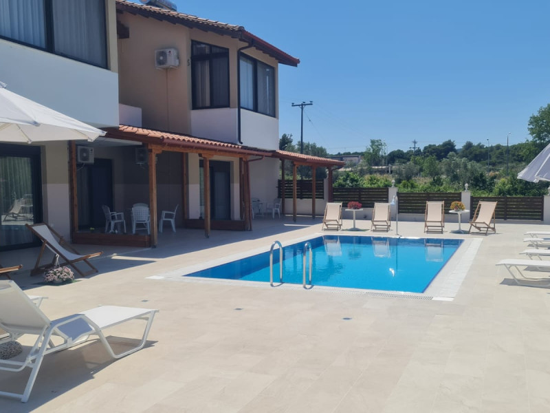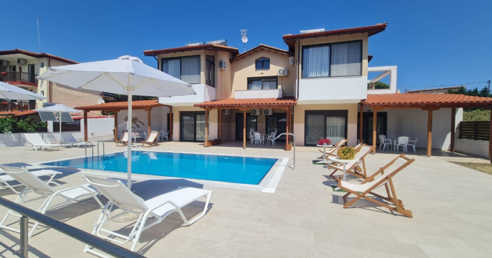 Allegro maisonettes are situated in Ormos Panagia, Sithonia. Only 250m from the largestand longest sandy beach, Trani Ammouda, it turns it the ideal place to spend your summer holidays. The two-storey maisonettes are equipped with kitchen, dining area, WC, bathroom, two bedrooms and laundry room with ironing board. Each maisonette can accommodate up to 6 or 7 people, as there is a pull-out sofa on the top floor. Also available are a/c, LCD TV, free WI-FI, closets, one double bed and two twin beds. The spacious backyard terrace and the pool are accessible directly from the ground floor rooms. Sunbeds & umbrellas are at the disposal of customers, as well as a trampoline for our younger guests. At the BBQ area near the pool there is a large wooden table and benches. Parking is also available. Shops, bars and restaurants are in a distance of 100m. The SKG airport is 92km away.Allegro maisonettes are situated in Ormos Panagia, Sithonia. Only 250m from the largestand longest sandy beach, Trani Ammouda, it turns it the ideal place to spend your summer holidays. The two-storey maisonettes are equipped with kitchen, dining area, WC, bathroom, two bedrooms and laundry room with ironing board. Each maisonette can accommodate up to 6 or 7 people, as there is a pull-out sofa on the top floor. Also available are a/c, LCD TV, free WI-FI, closets, one double bed and two twin beds. The spacious backyard terrace and the pool are accessible directly from the ground floor rooms. Sunbeds & umbrellas are at the disposal of customers, as well as a trampoline for our younger guests. At the BBQ area near the pool there is a large wooden table and benches. Parking is also available. Shops, bars and restaurants are in a distance of 100m. The SKG airport is 92km away.