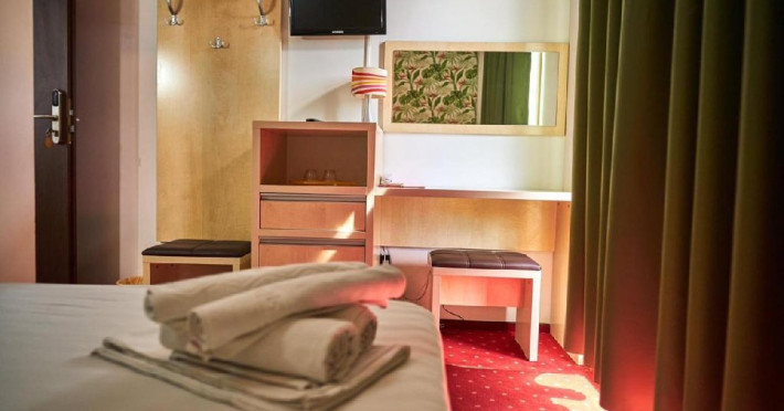Camera single cu o suprafata de 14 mp, este dotata cu un pat de o singura persoana, baie cu dus, uscator de par, internet, minibar, AC, TV.