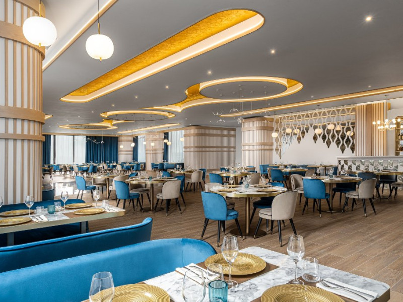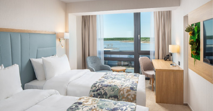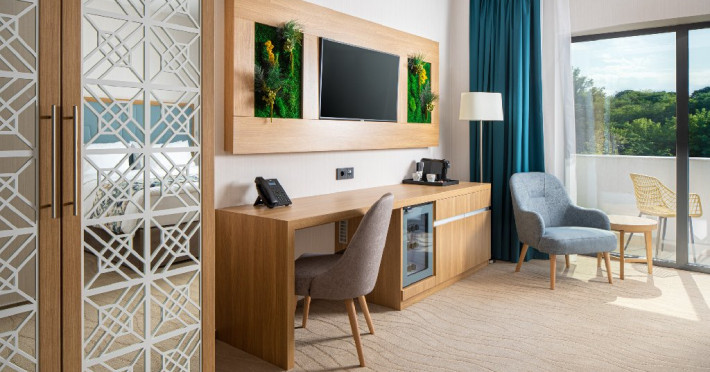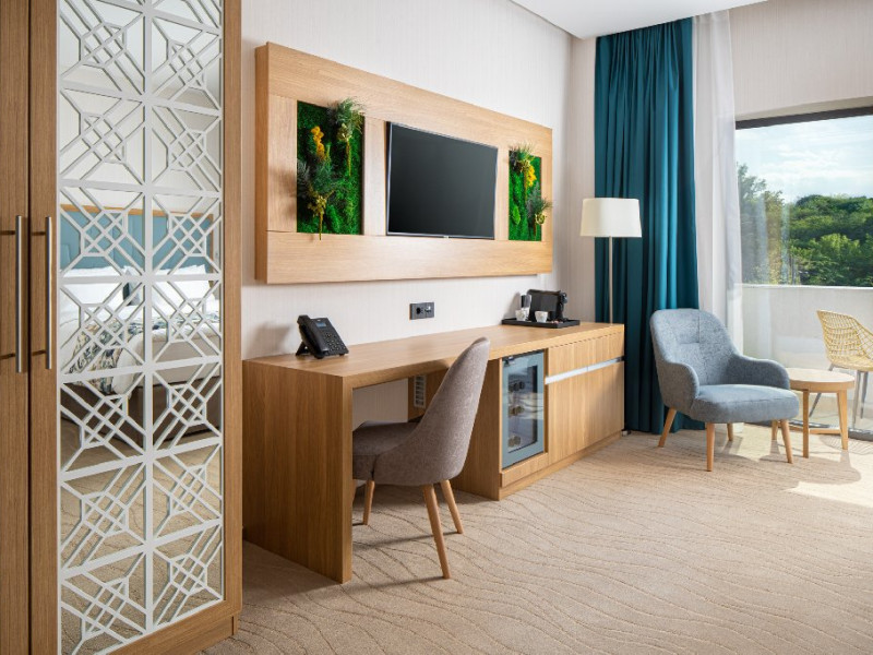 Toate camerele sunt dotate cu aer conditionat, aparat de cafea cu capsule, TV cu ecran plat, minibar, seif, uscator de par, halat si papuci de baie