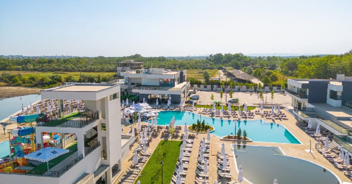 un parc acvatic cu trei piscine si tobogane, plaja privata cu 1000 sezlonguri, beach baruri , restaurante, spa, teren multisport pentru fotbal, baschet, tenis de camp.