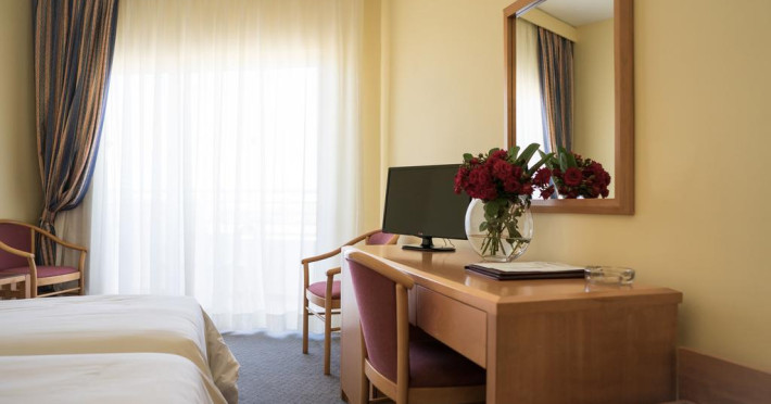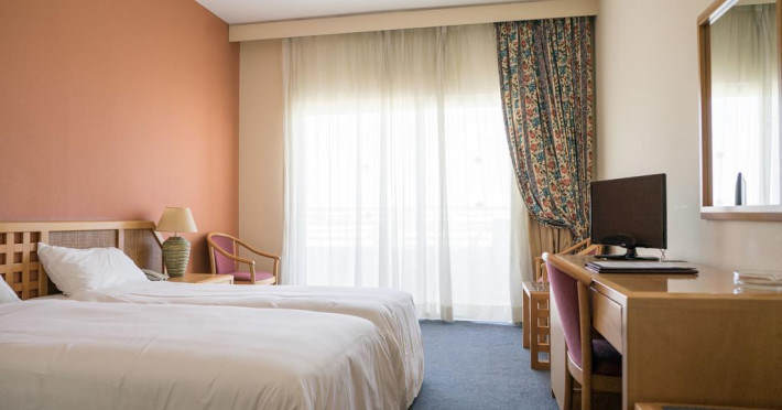 Sunt disponibile 272 camere. Unele camere au balcon cu vedere la mare sau la piscină. Camerele luminoase de la Aloe Hotel sunt dotate cu mochetă, aer condiționat, Tv cu canale prin satelit și seif. În camere există baie cu cadă sau duș ce are în dotare foehn și articole de toaletă gratuite. Oaspeții au la dispoziție serviciul de room service pentru a servi masa sau diverse băuturi. Oaspeții au acces gratuit la serviciul Wi-fi în camere. Curățenia in cameră se face zilnic. Proprietatea oferă camere pentru familie cu o suprafață mai mare și un număr mai mare de paturi față de cele standard. Se pot rezerva de asemenea camere pentru nefumători.