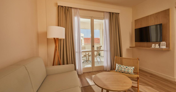 Camerele confortabile de la Aluasoul Zakynthos au pardoseală de gresie/ marmură, aer condiționat, Tv cu canale prin satelit și seif. Fiecare cameră oferă cană-fierbător și mașină pentru prepare cafea sau ceai. Oaspeții pot solicita serviciul de room service pentru a servi masa sau diverse băuturi. Oaspeții au acces gratuit la serviciul Wi-fi în camere. În camere există baie cu cadă sau duș ce are în dotare foehn și articole de toaletă gratuite. Camerele au balcon cu vedere la mare sau la piscină. Curățenia in cameră se face zilnic. Există camere care au zonă de relaxare cu canapea, ceea ce asigură un plus de confort și răsfăț.