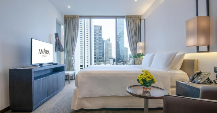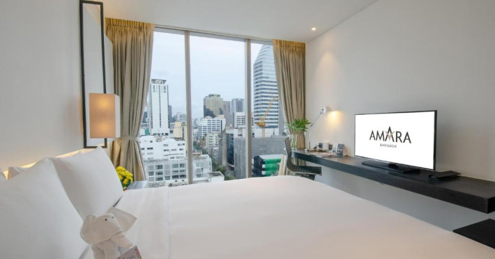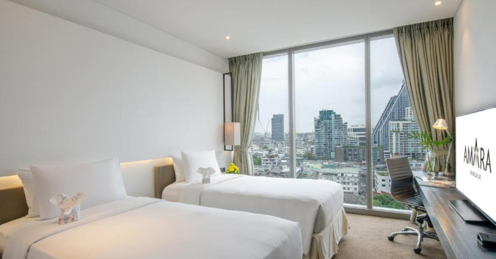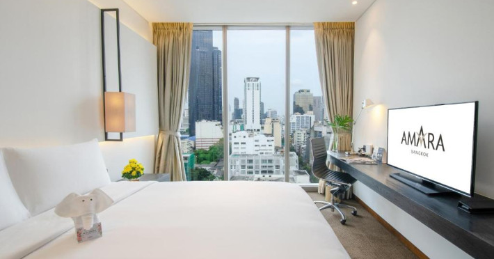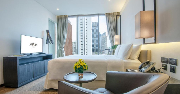 La hotel, fiecare cameră este dotată cu aer condiționat, zonă de relaxare, TV cu ecran plat cu canale prin satelit, cutie de valori și baie privată cu bideu, articole de toaletă gratuite și uscător de păr. La Hotelul Amara Bangkok, fiecare cameră include lenjerie de pat și prosoape.