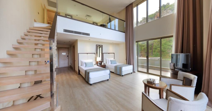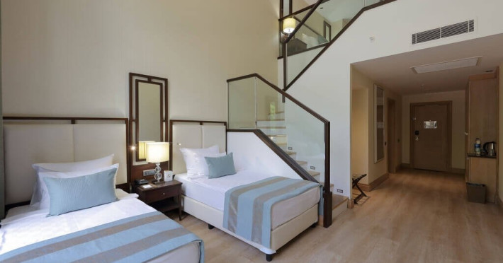 - 2 duplex family suite executive (vedere la mare, la primul nivel: dormitor; la nivelul doi: dormitor cu usa, 2 TV, 2 bai, terasa, max. 4 pers., 79 m2);